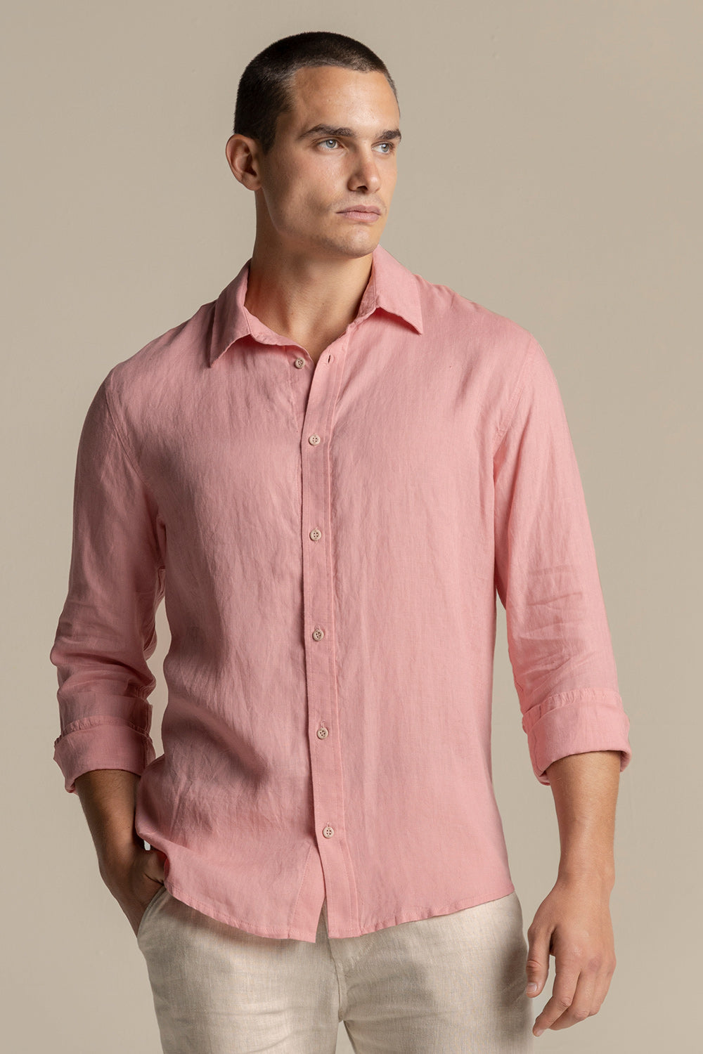 Pink linen canaria shirt, long sleeves, slim fit, classic collar, back darts.. Colour pink, Ref. SH58R61