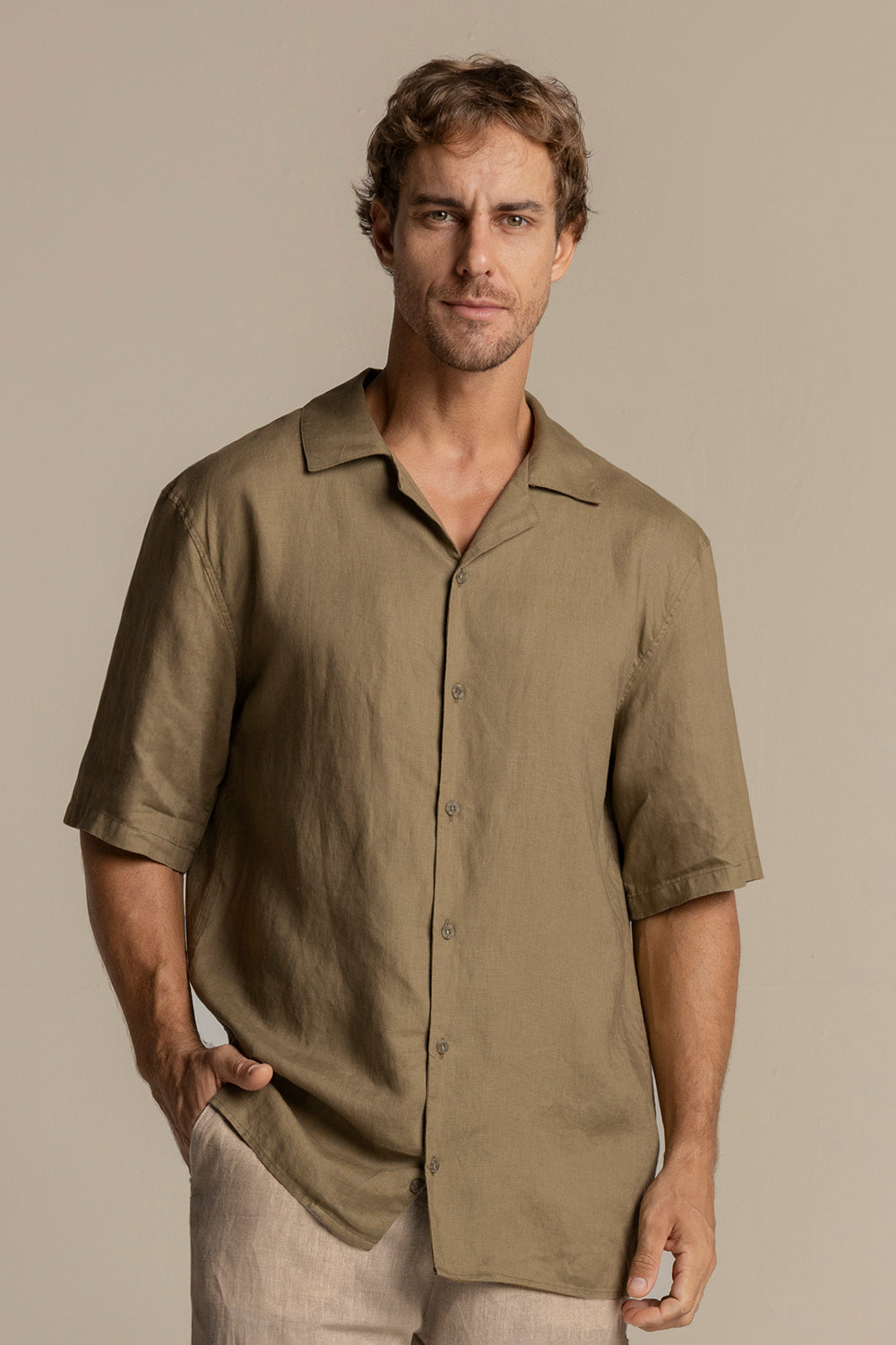 Olive green linen Ibiza shirt, short sleeves, relaxed fit, bowling collar.. Colour olive green, Ref. SH56V61