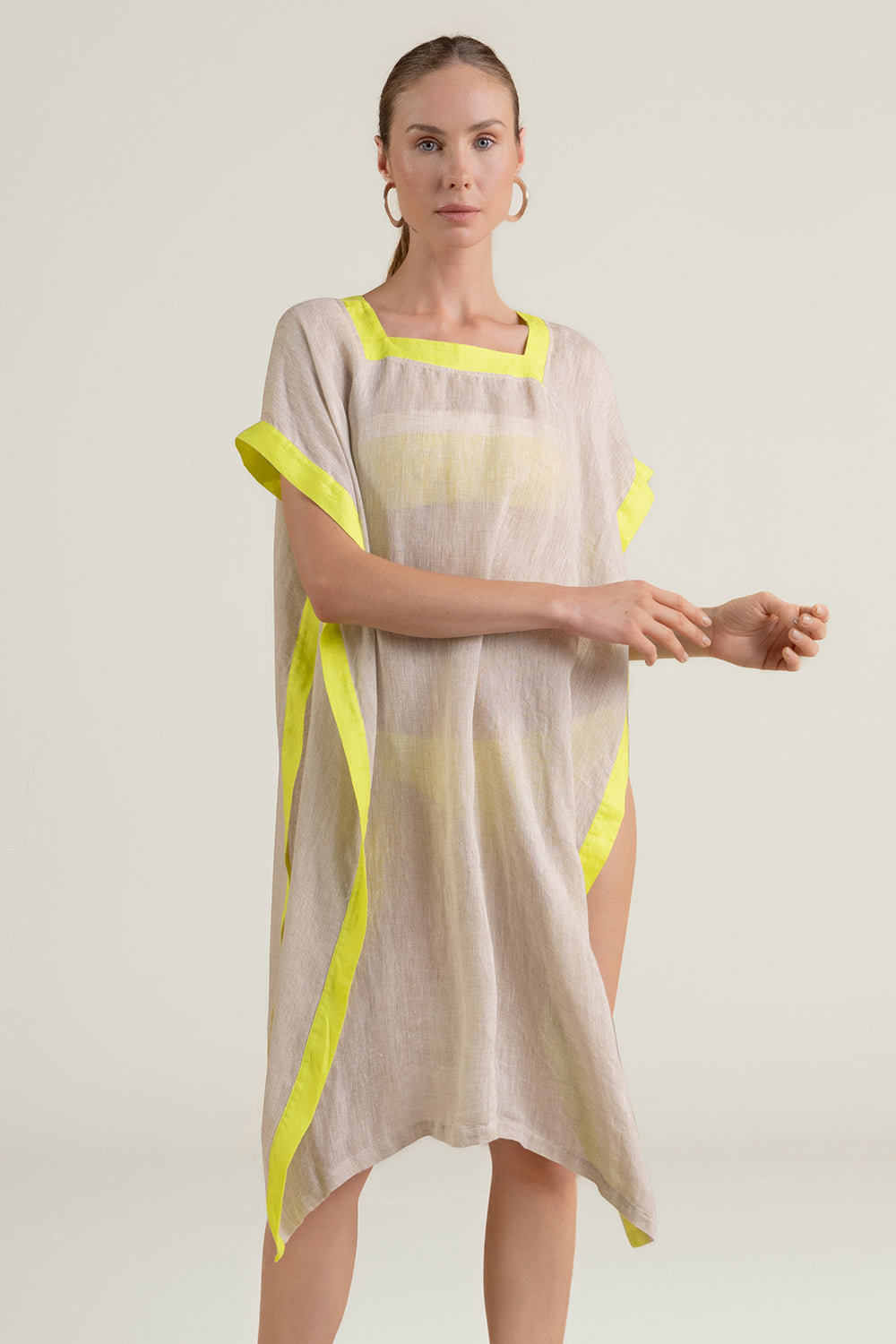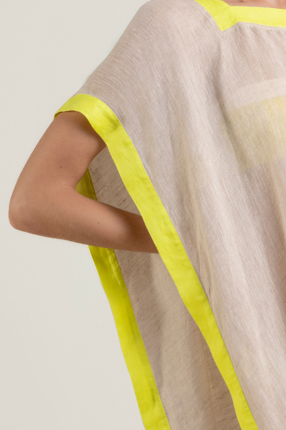 Short cover up in 100% khaki linen gauze with wide contrast trim in 100% neon linen, coin detail characteristic of our brand with "t" engraved in gold - dipped to avoid oxidation.. Color khaki/neon, Ref. 0A58C53