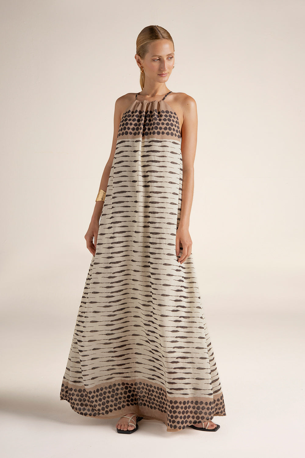 Long dress in polka-dot and stripe printed fabric; halter neckline with tie at the neck for a better fit; fully lined; gold-plated tips and coin with engraved “T”.. Color brown / ivory / black, Ref. 0F74062