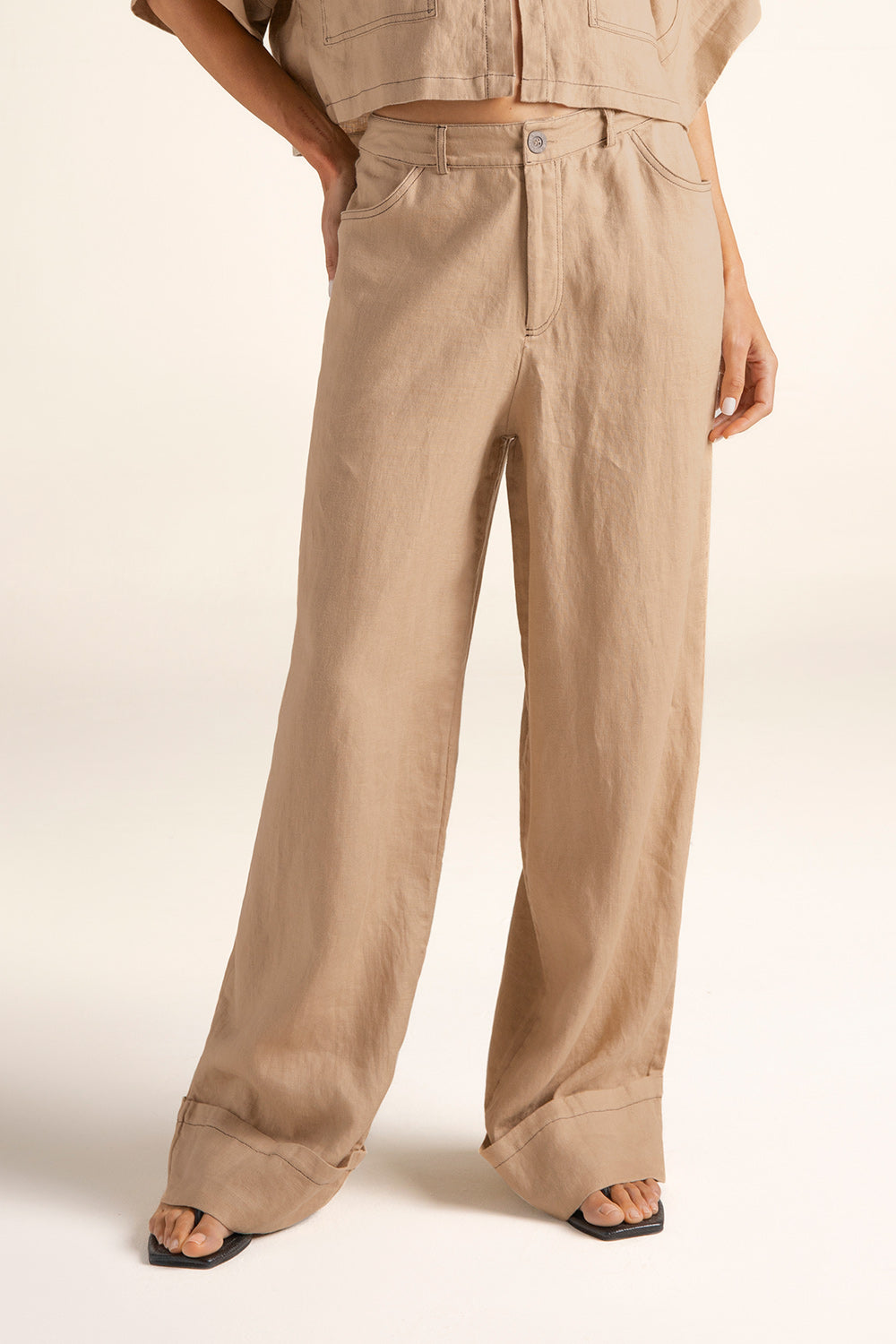 Linen pants; contrasting black seams; high waist; rounded front hip pockets and right back patch pocket; zipper and button closure with “Touché” engraving; belt loops at waistband; straight leg with wide hem; gold-plated coin with engraved “T”, a distinctive brand detail.. Color kahki, Ref. 0A14C62
