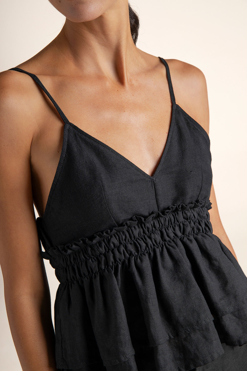 Short linen top; shirred waistband; thin straps to tie at the back for a better fit; gold-plated coin with engraved “T”, a distinctive brand detail.. Color black, Ref. 0A25N62
