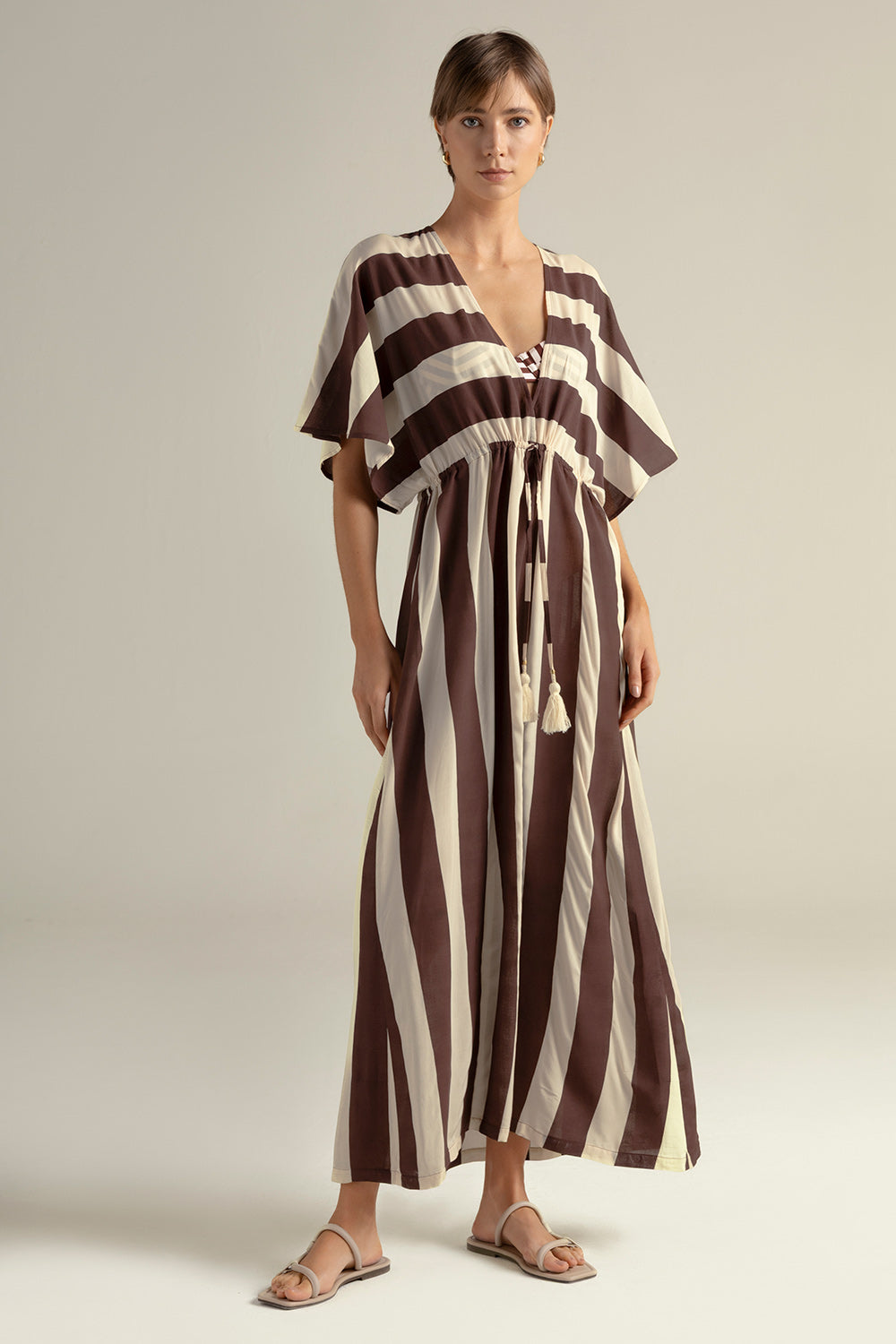 Long cover up in 100% cotton with ivory and wine striped print blocks, Deep v-neckline, wide sleeves, and a waist drawstring with tassels for a customized fit, gold-plated coin detail characteristic of our brand with "t" engraved .. Color print burgundy/ivory, Ref. 0A53061