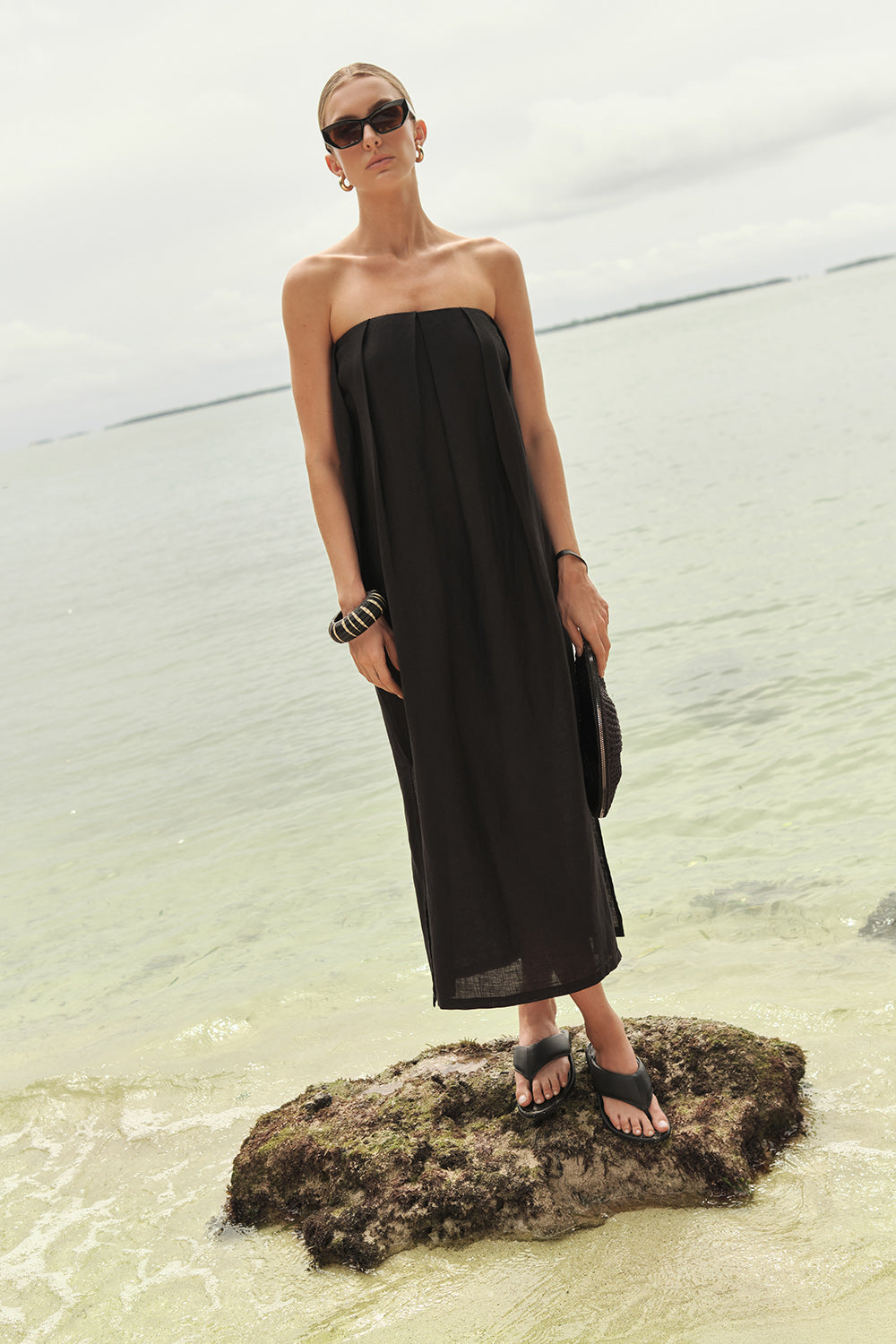 Long Bandeau dress in 100% linen, black color, with pleats at the neckline and invisible zipper at the back.. Color black, Ref. 0F19N61