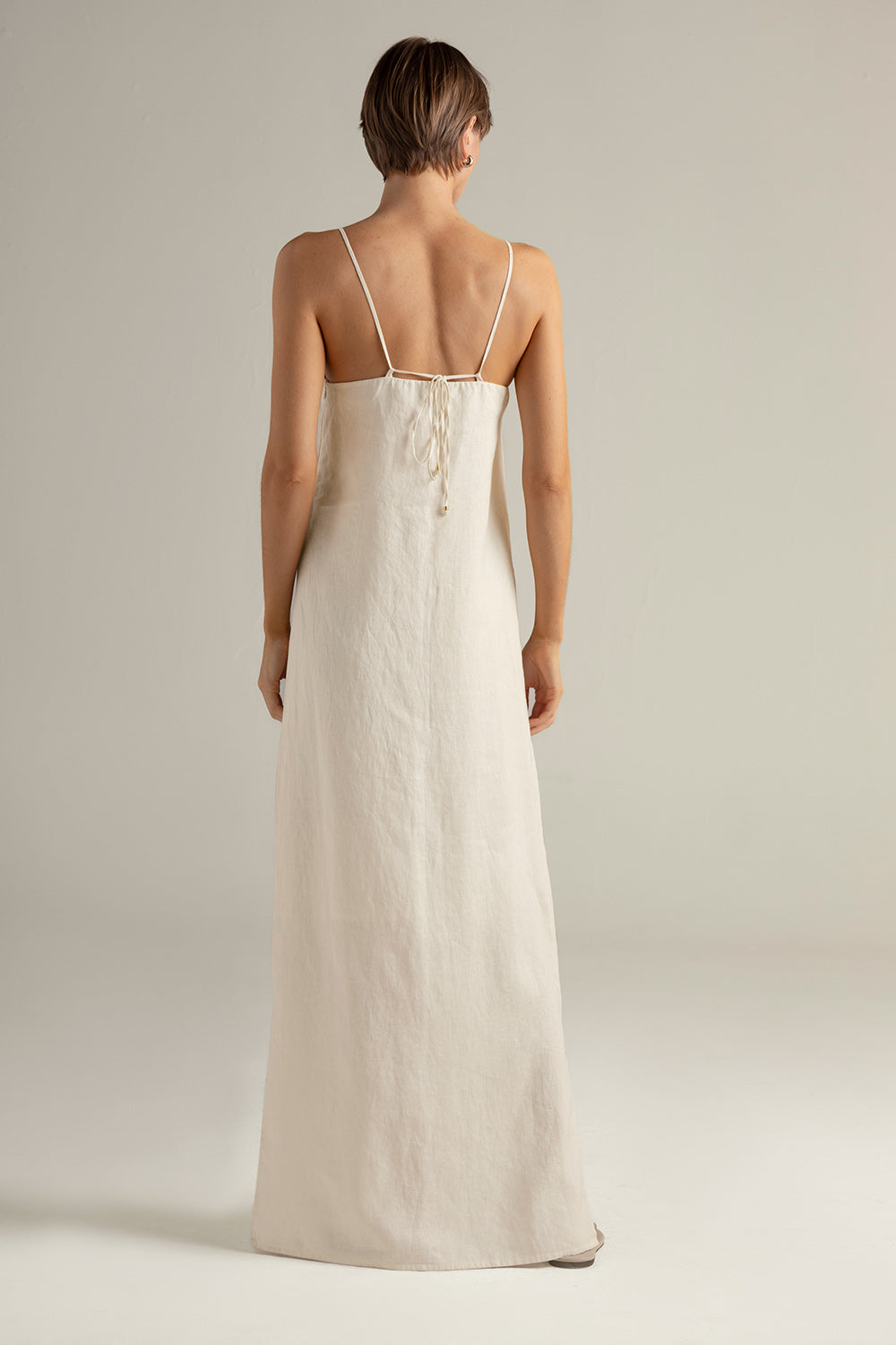 Straigth long dress in 100% linen, cream color, with thin straps adjustables for a customizable fit, invisible zip side, opening on the sides, interior lining, gold- plated dipped detailing to avoid oxidation. Color cream, Ref. FI14C61