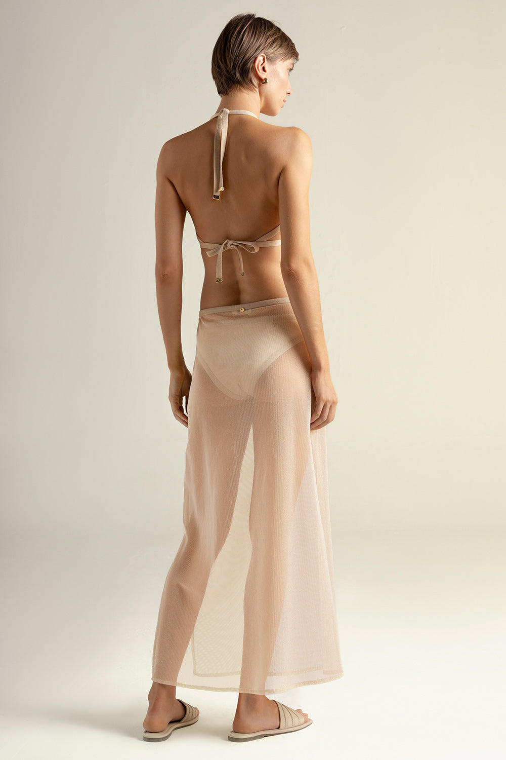 Long skirt in mesh fabric with plateden lurex and contrast trim with lurex in waistband, gold-plated coin detail characteristic of our brand with "t" engraved. Color beige/plateden lurex, Ref. 0F26B61
