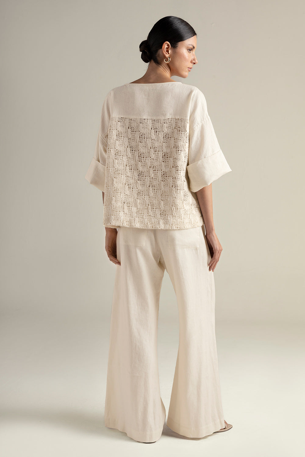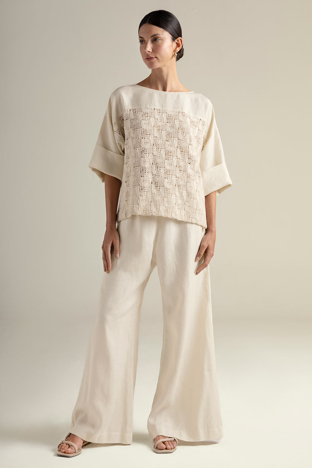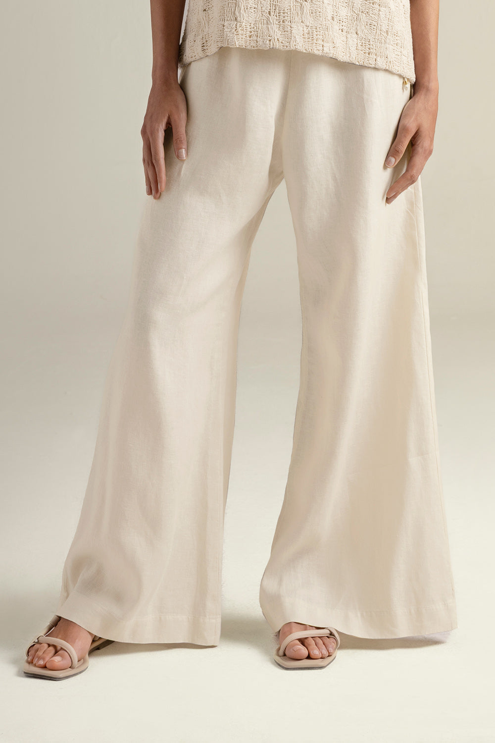 Wide Pants in 100% linen, cream color, adjustable waist straps for a customizable fit. Color cream, Ref. FI13C61