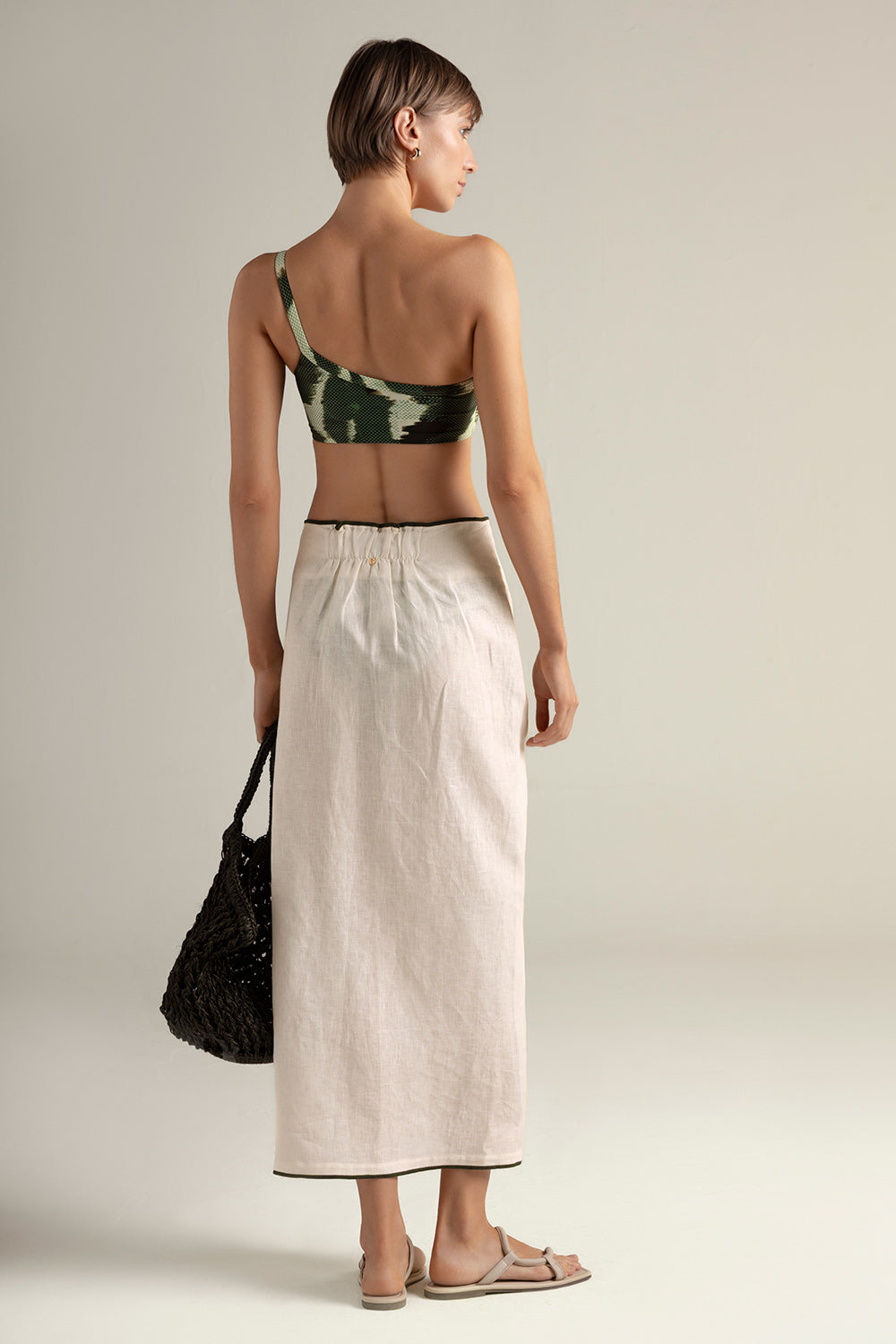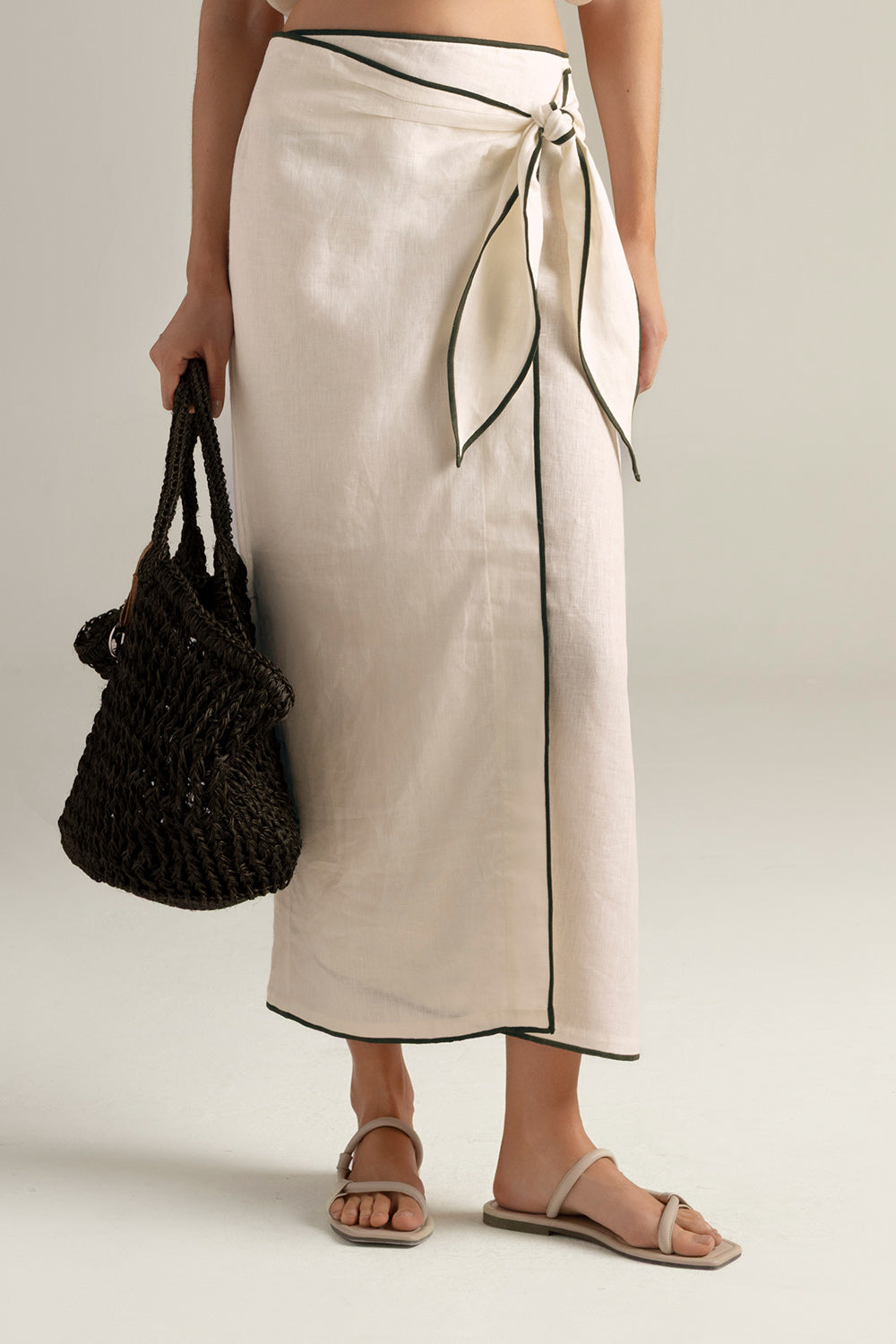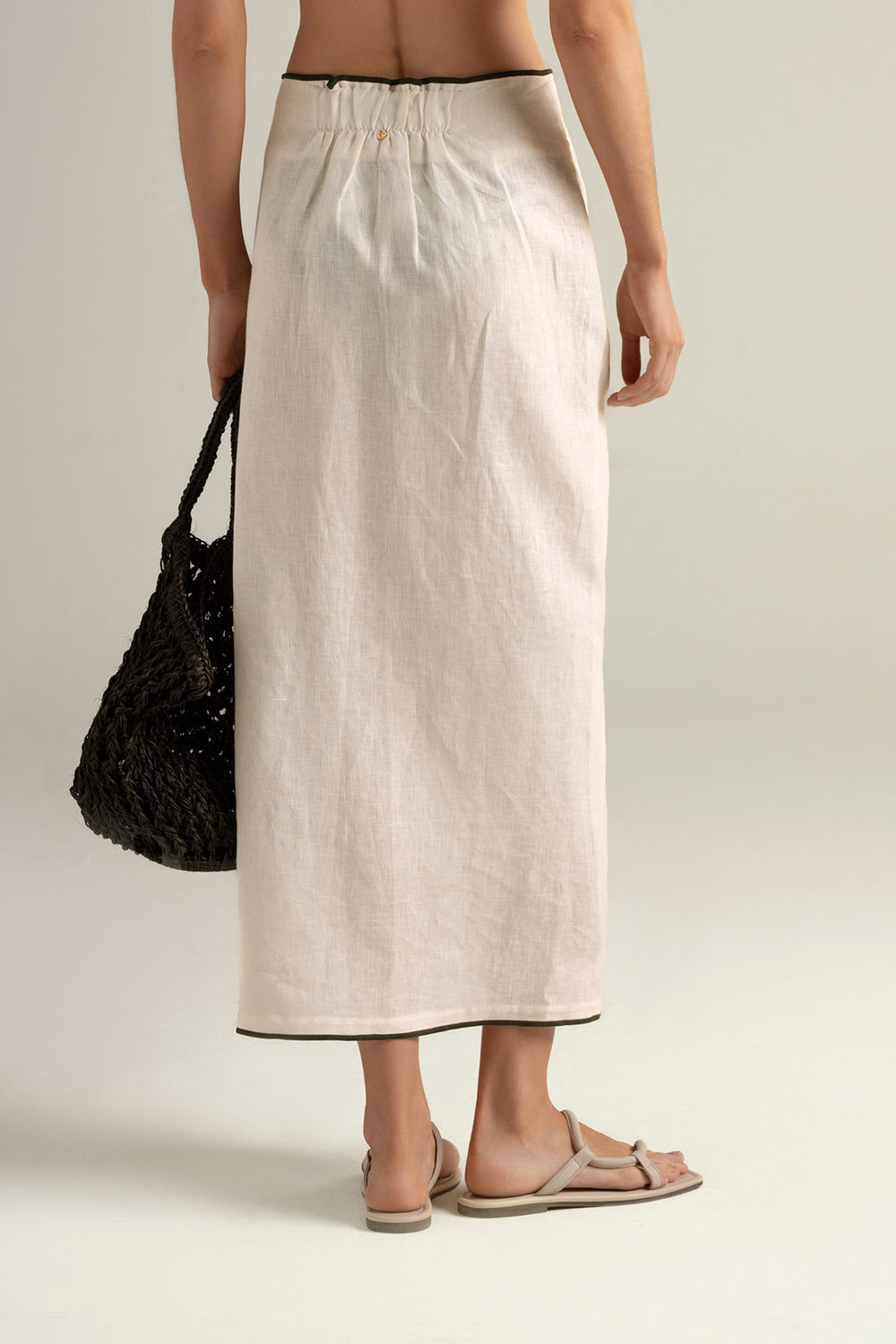 Long Pareo skirt in 100% linen, cream color, with exposed green piped seams, crossed in front with inner button, adjustable tie straps for a customizable fit, midi length, gold-plated coin detail characteristic of our brand with "t" engraved . Color cream, Ref. 0F39C61