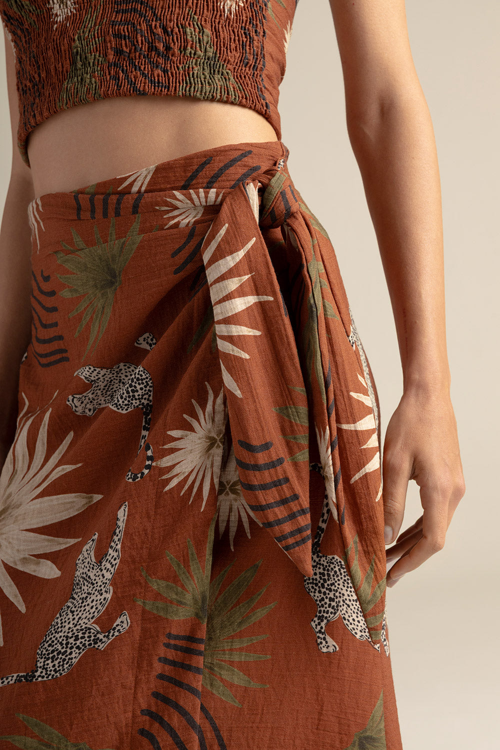 Pareo skirt in terracotta print, crossed in front with inner button, adjustable tie straps for a customizable fit, gold-plated coin detail characteristic of our brand with "t" engraved . Color print terracotta, Ref. 0F45061