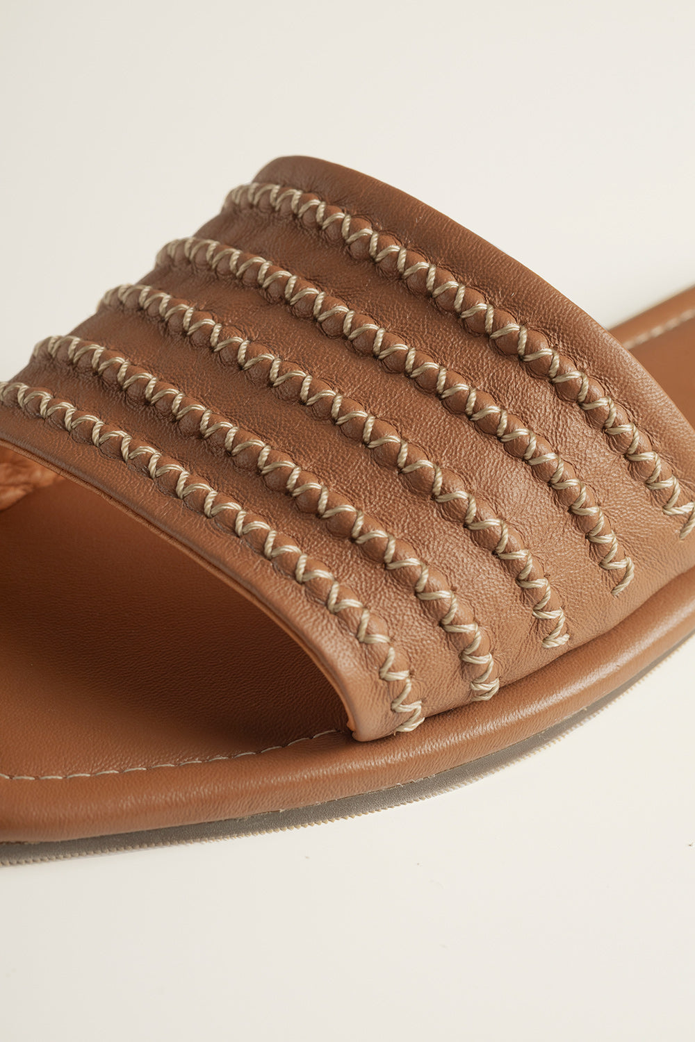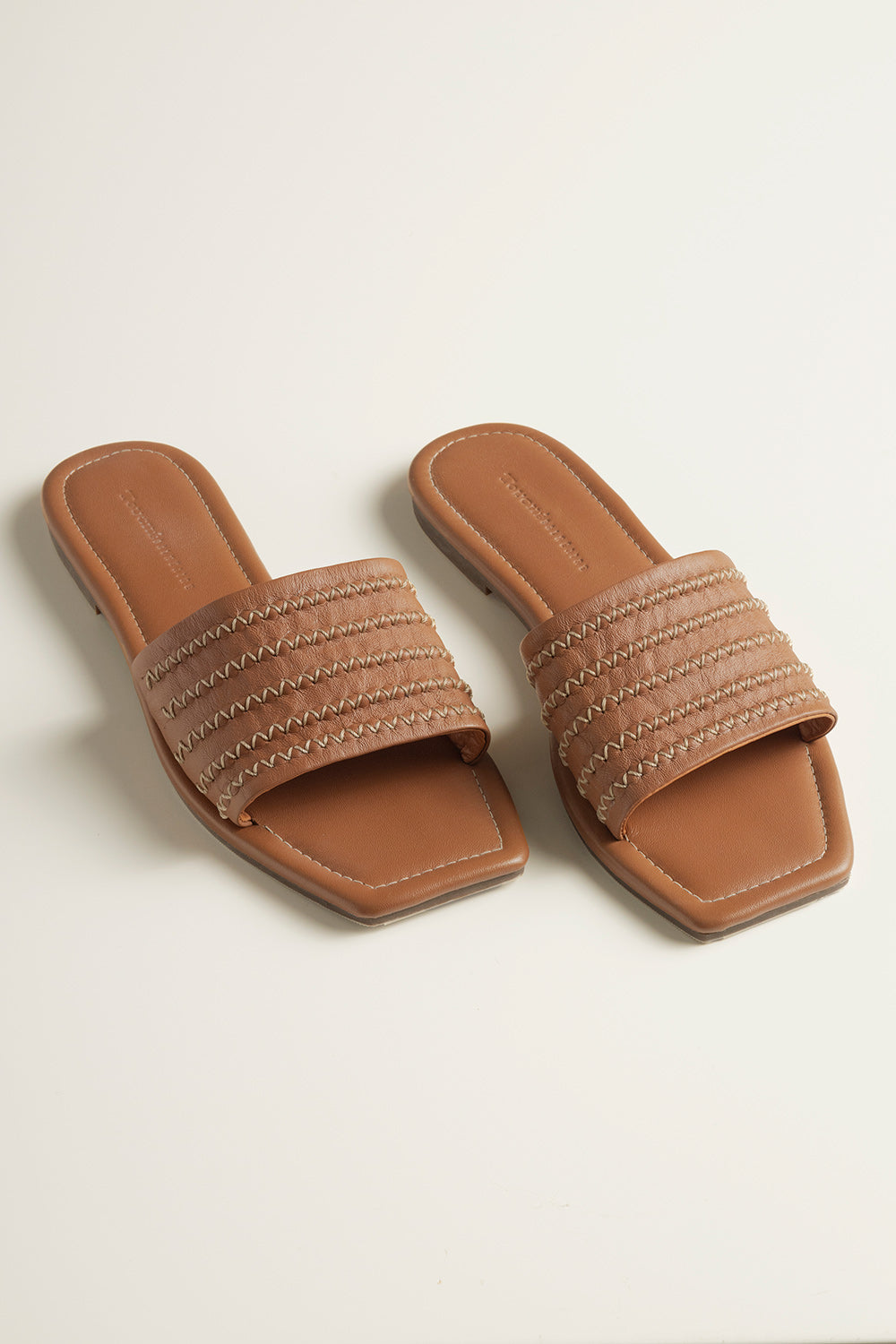 Flat sandals in caramel-tone leather, featuring a square toe and wide strap with contrast stitching detail. padded insole and flexible outsole for enhanced comfort.. Color brown, Ref. 0S45C61
