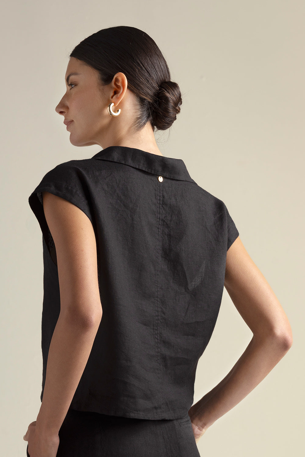 Short sleeves top in 100% linen, black color, with a Deep v-neckline and bowling-style collar, gold-plated coin detail characteristic of our brand with "t" engraved .. Color black, Ref. 0A79N61