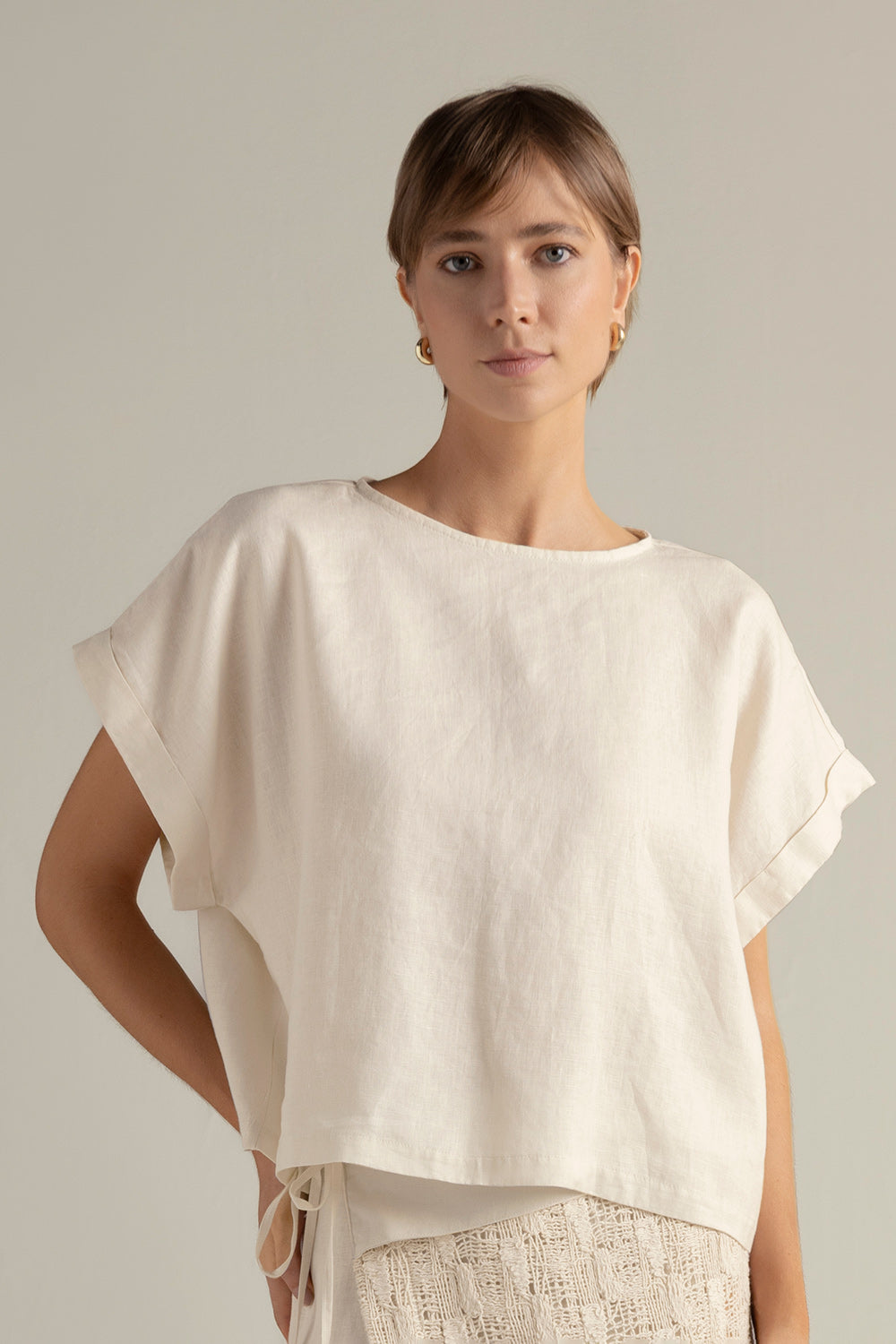 Short sleeves top in 100% cream linen, with wide armholes and a back closure with button.. Color cream, Ref. FI10C61