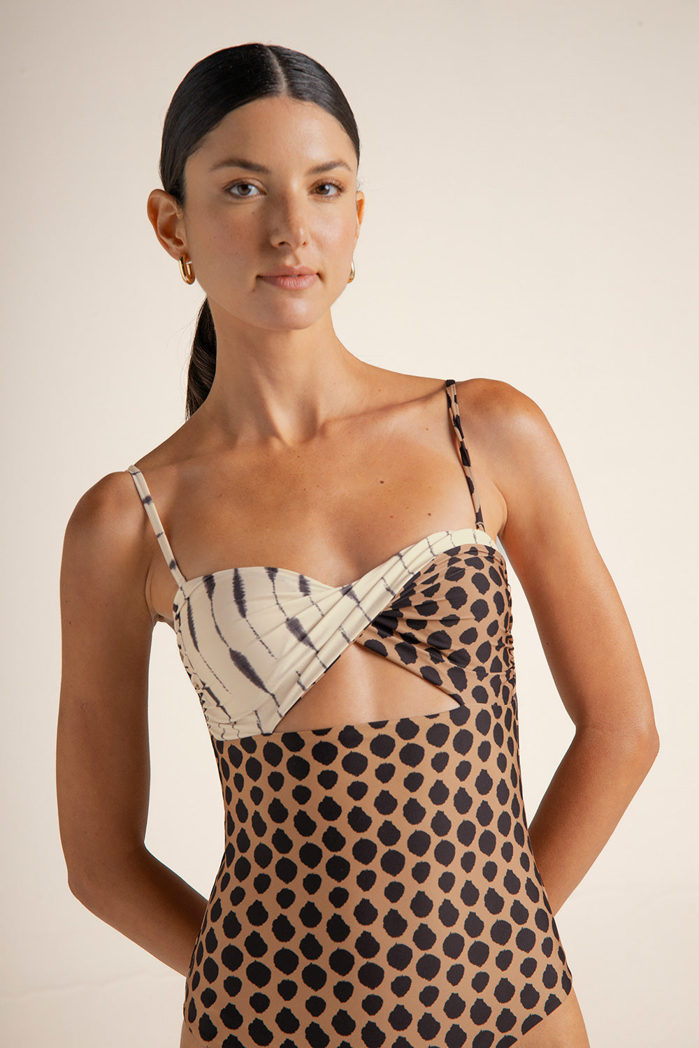 Bandeau one-piece in polka-dot printed fabric, with a twisted top in mixed dots and stripes; removable straps for a strapless option or with straps to tie and achieve a better fit; internal silicone elastic at the back top edge; gold-plated accessories with engraved “Touché” plaque; fixed cups; UV-protective fabric.. Color brown / ivory / black, Ref. 0E81062