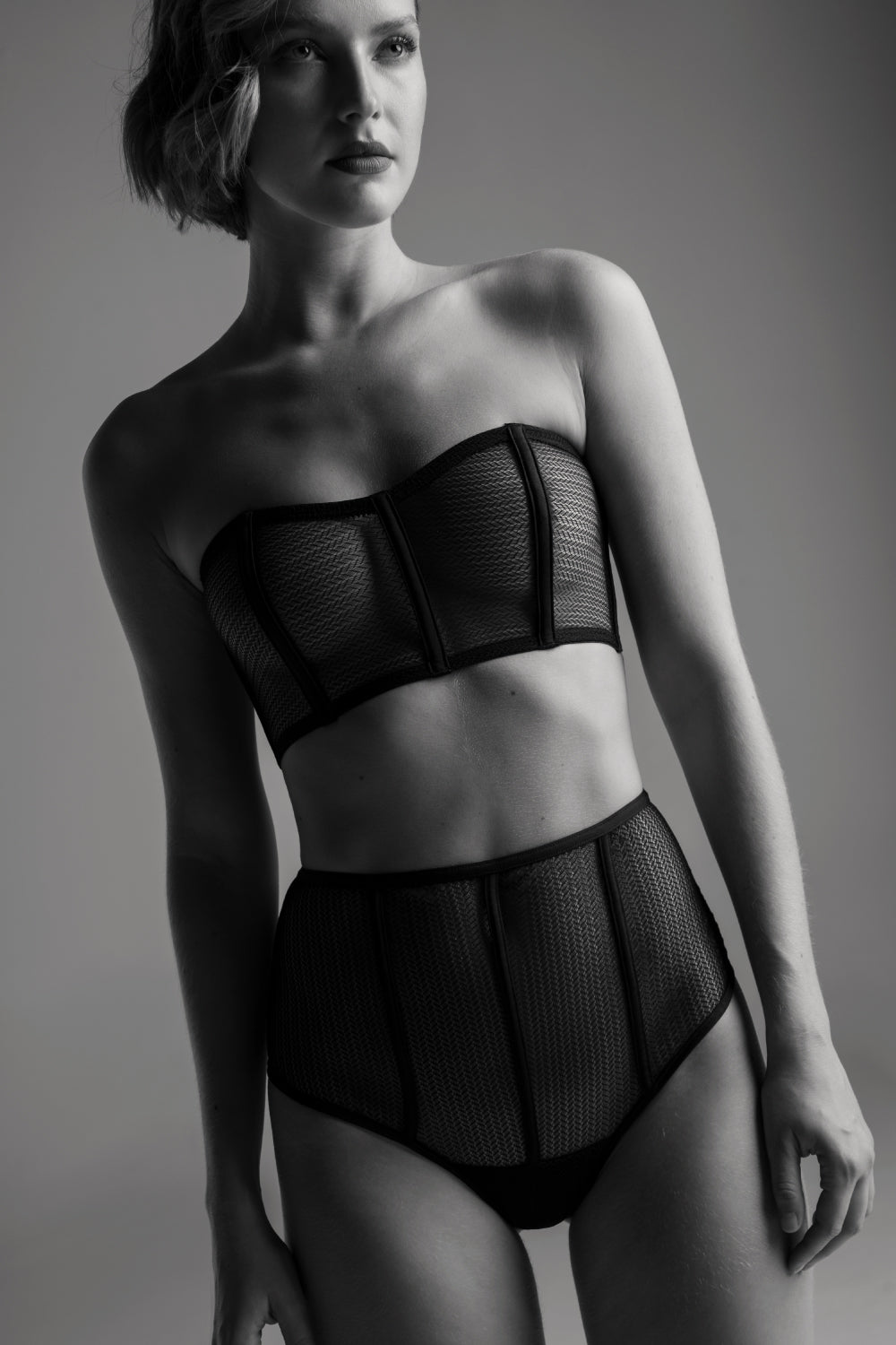 Bodice in ultra-sheer open tulle, sweetheart neckline, internal boning, no straps, fasteners at back. Color black, Ref. 0441N62