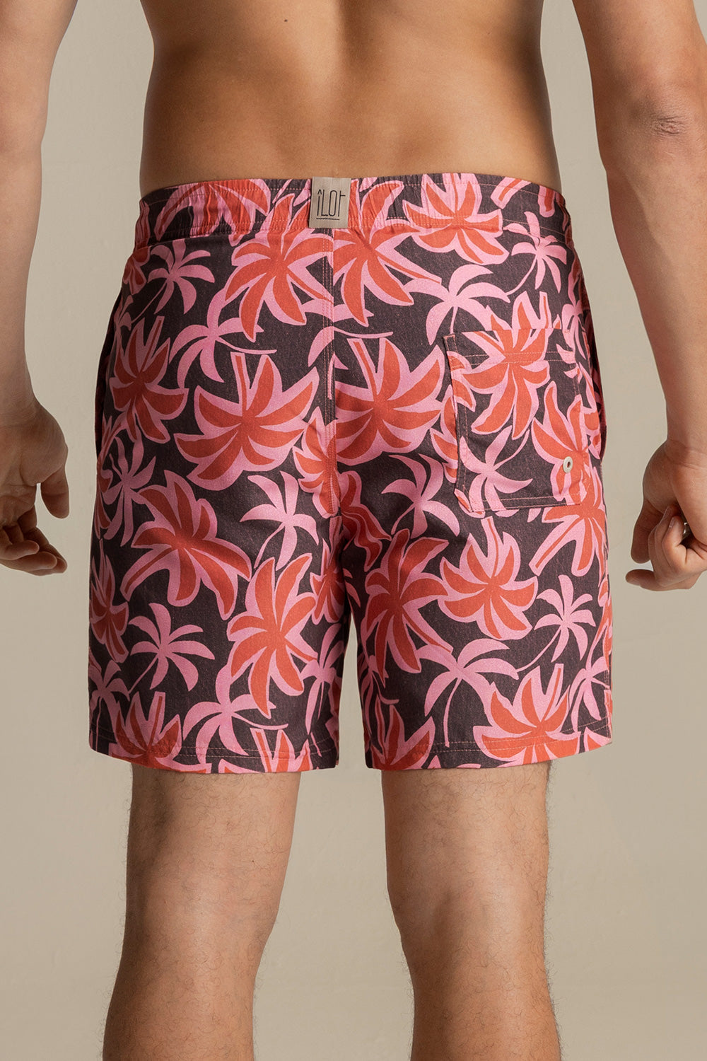 Bahía short swimshorts pink palm tree print, classic cut with elastic waistband and greysh drawstring with rubber tips, matte greysh zamak eyelets and patch pocket. Colour multicolor, Ref. CH32061