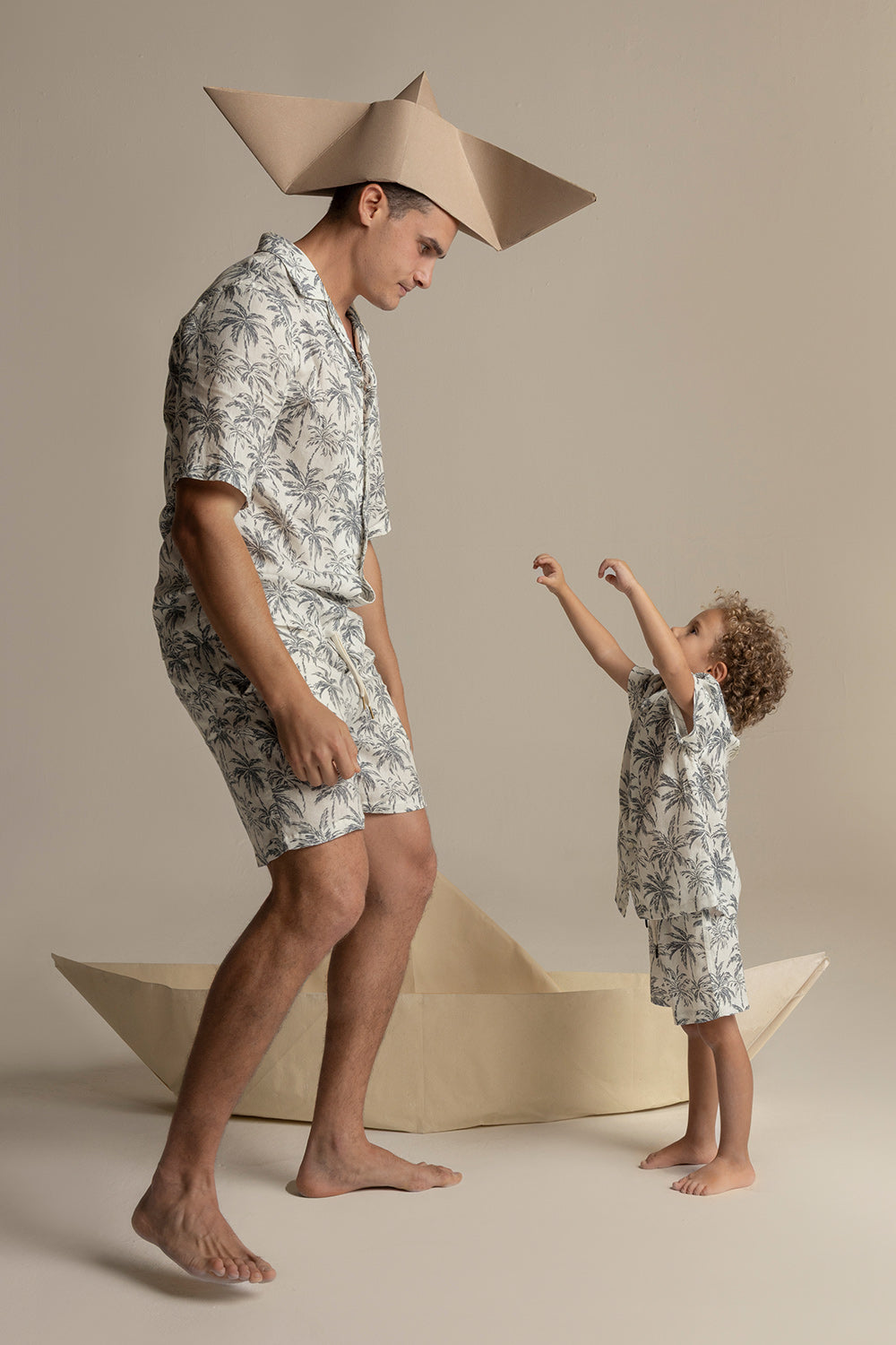 Kids palm print linen/lyocell shorts, relaxed fit, side pockets, elastic waistband with drawstring, back patch pocket. Colour blue/off white, Ref. BK03061