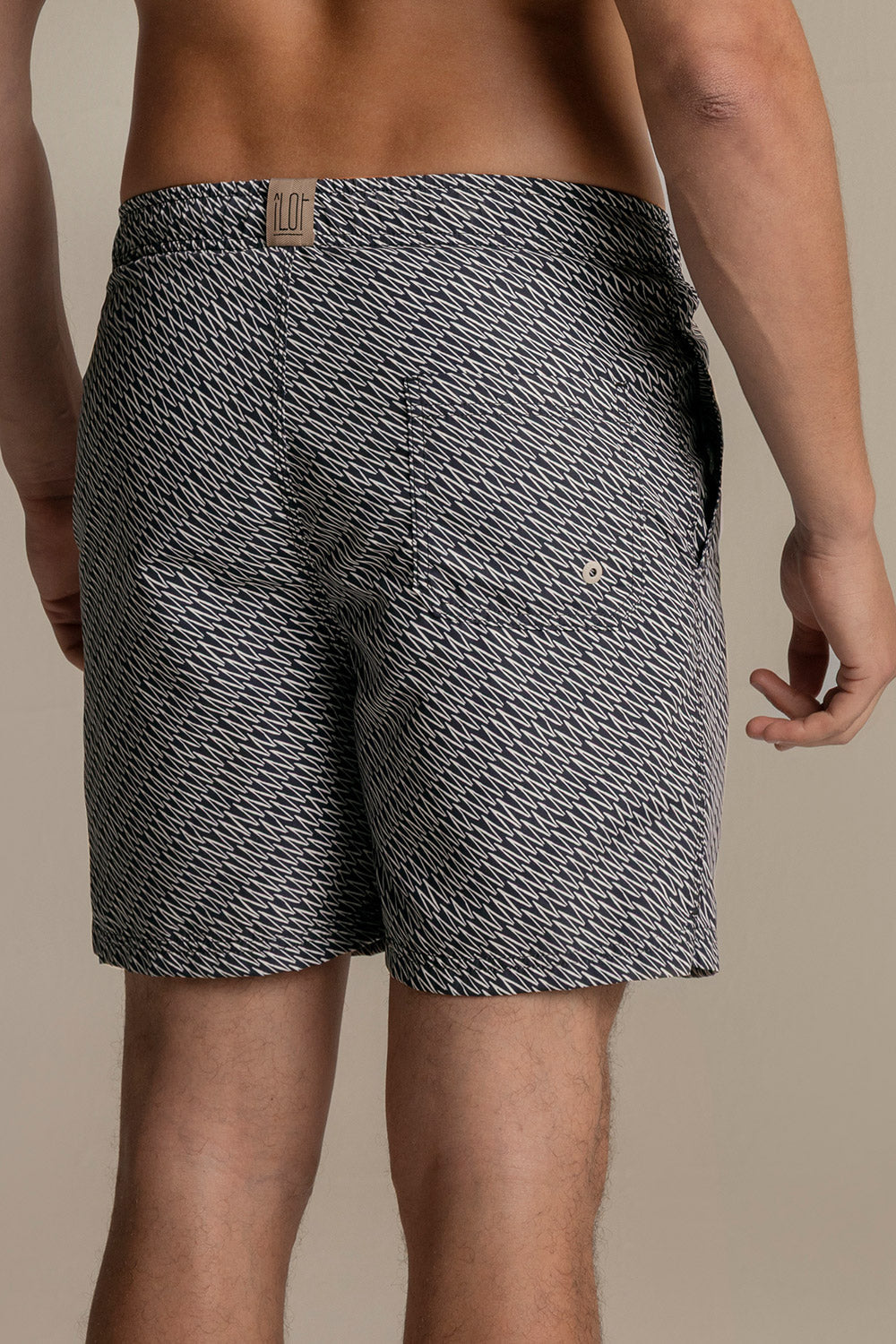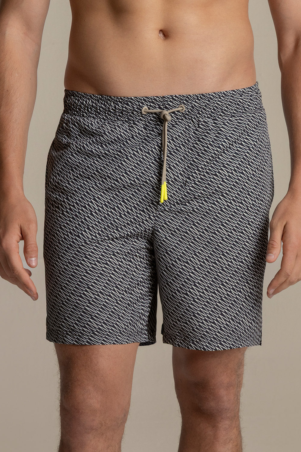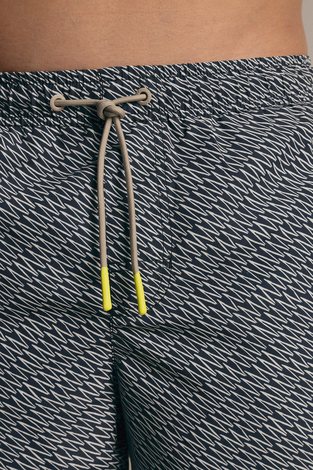 Bahía mid swimshorts blue zig zag print, classic cut with elastic waistband and greysh drawstring with neon rubber tips, matte greysh eyelets and patch pocket. Colour blue/ivory, Ref. MH27061