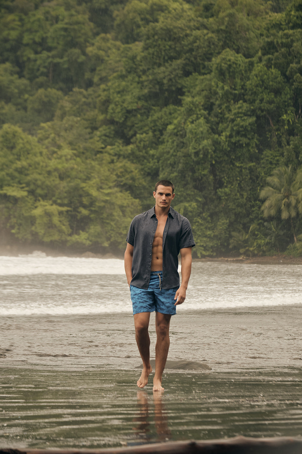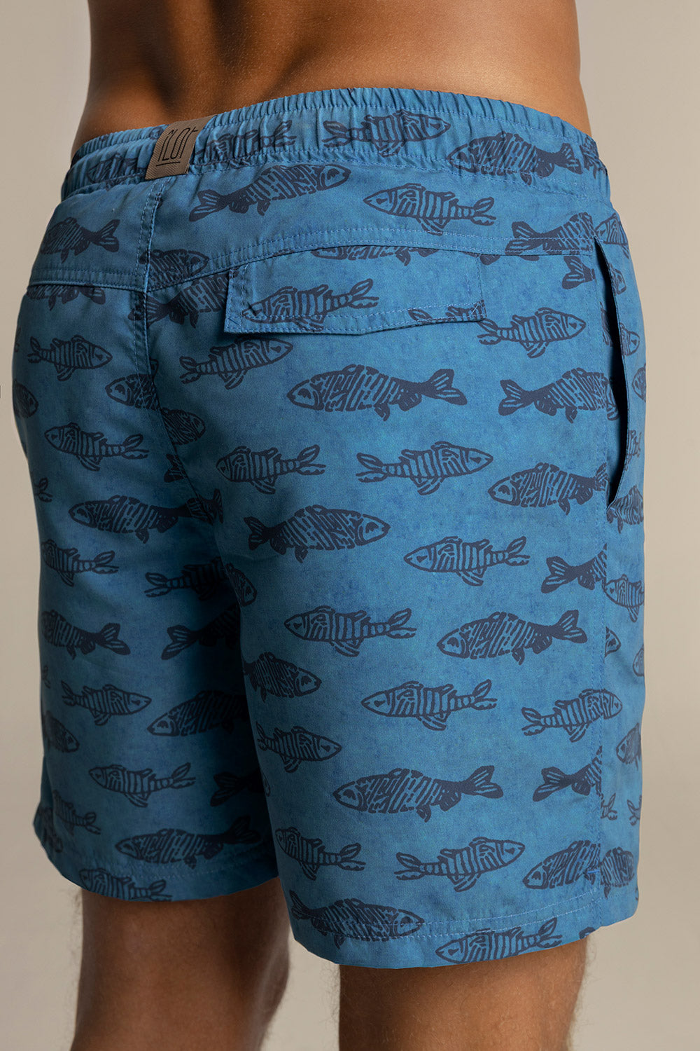 Península short swimshorts, blue fish print, classic cut with elastic waistband and greysh drawstring with rubber tips, matte greysh eyelets, and flap pocket. Colour blue, Ref. CH24061