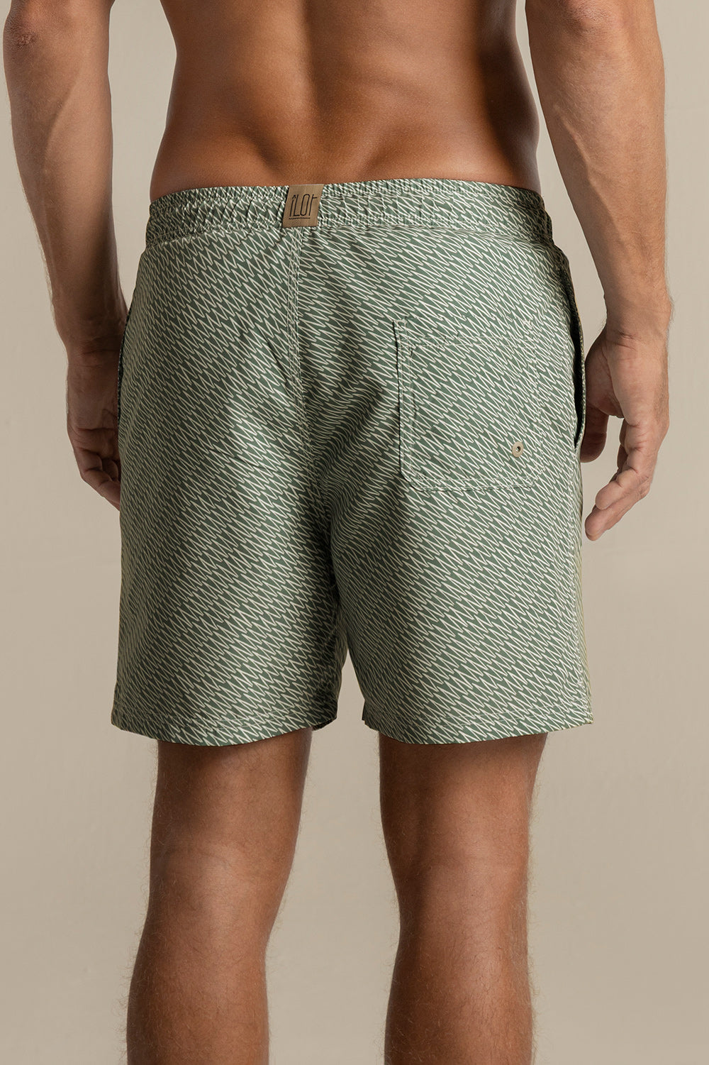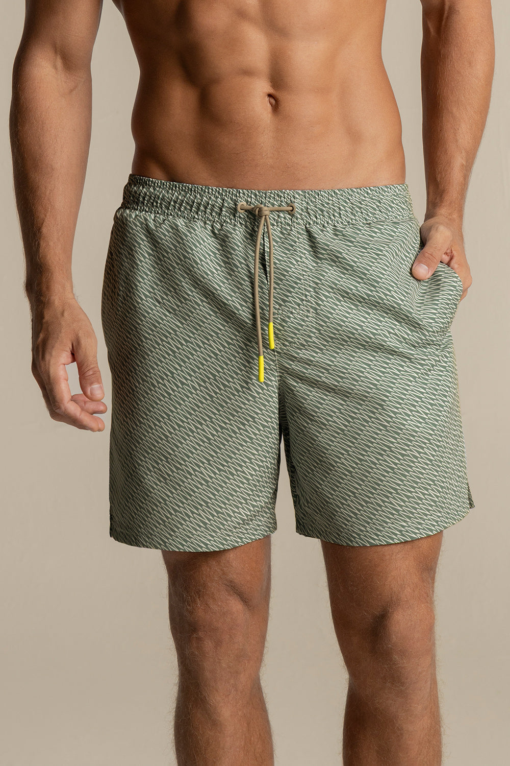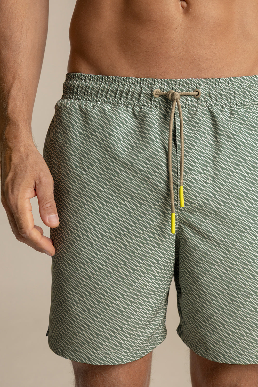 Bahía mid-length shorts , zigzag print, classic cut with elastic waistband and greysh drawstring with neon rubber tips, matte greysh eyelets, and patch pocket. Colour green/ivory, Ref. MH22061