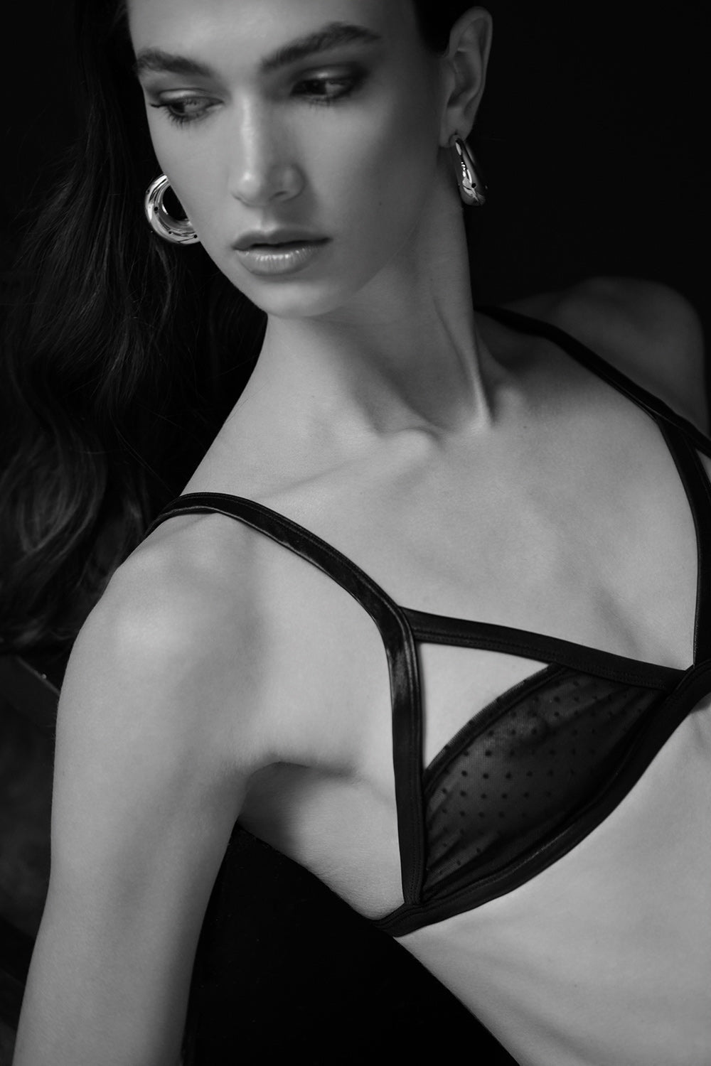 Triangle bra in transparent flocked tulle and leather-look microfiber. without pads or underwire. uncovered piece. golden side closure . Color black, Ref. 2486N61