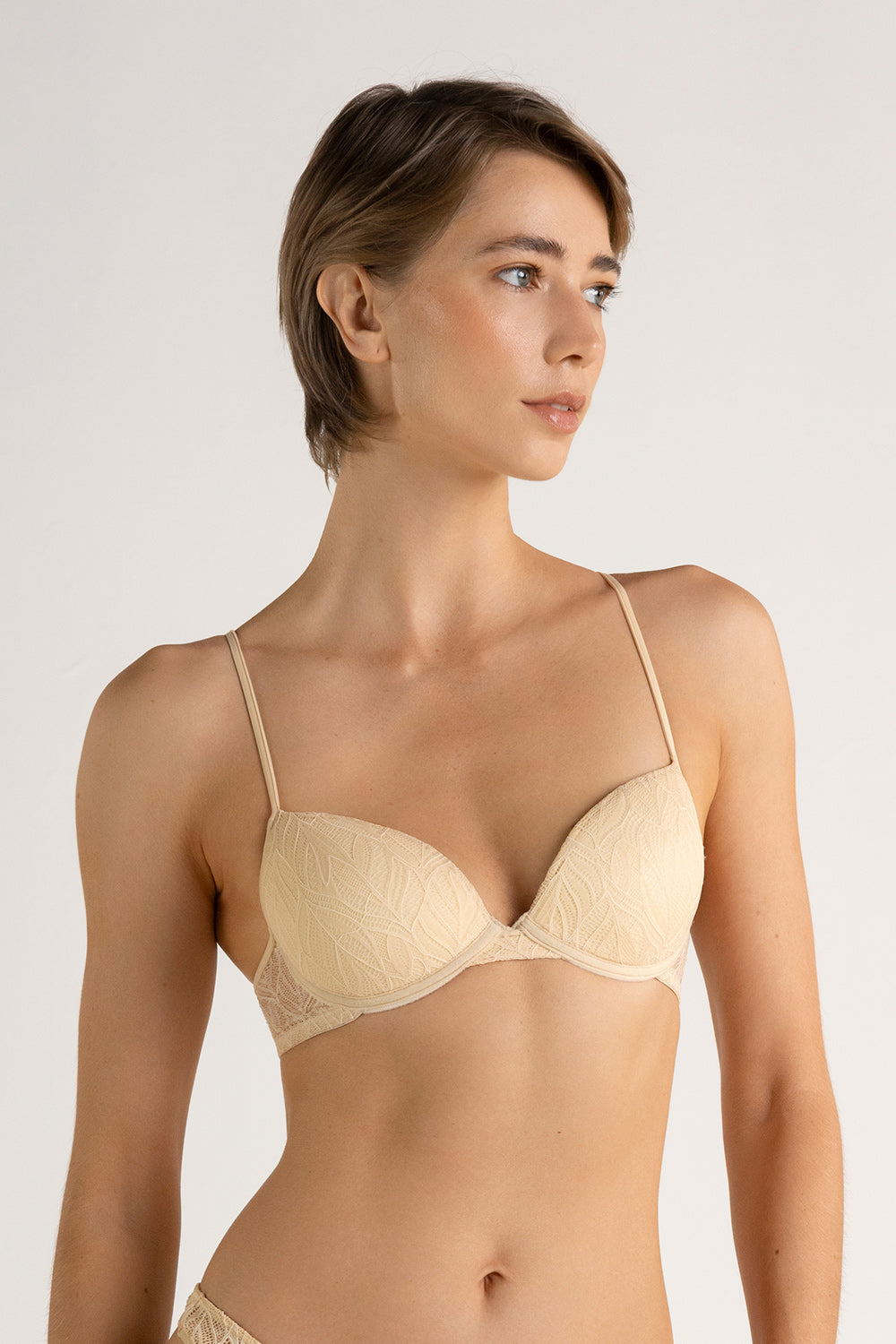 Classic lace bra with pads and underwire. adjustable straps. fasteners at back. Color cream, Ref. 2425B61