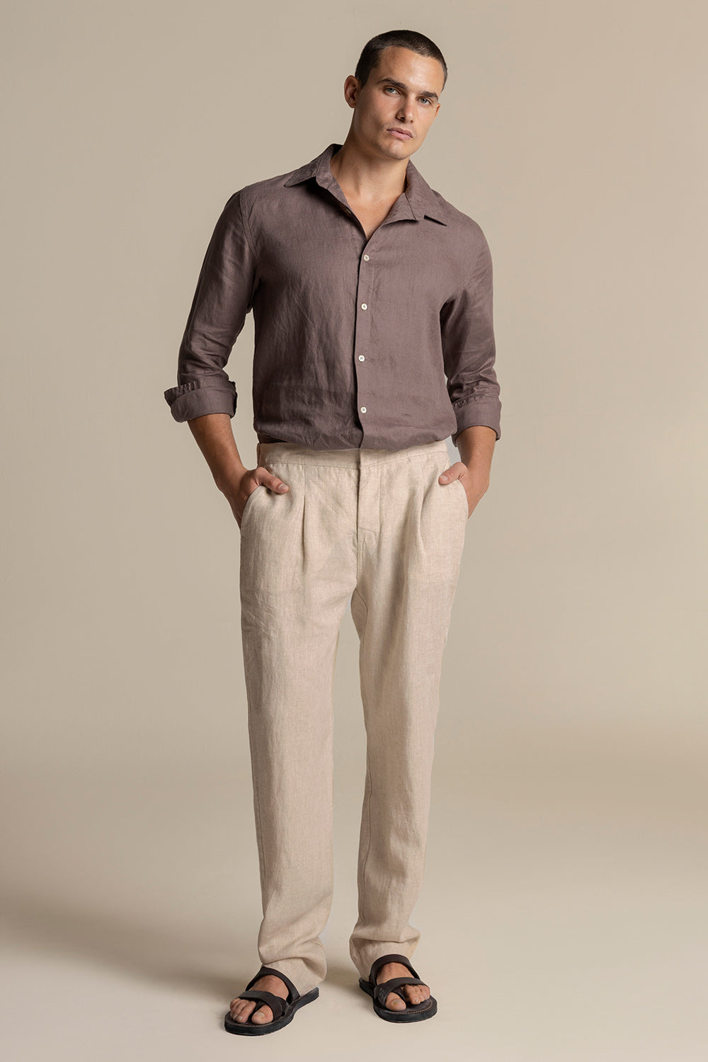 Linen classic fit pants with side pockets, zip and button close front, elastic waistband on back, and back welt pockets. Color Khaki, Ref. PH50051