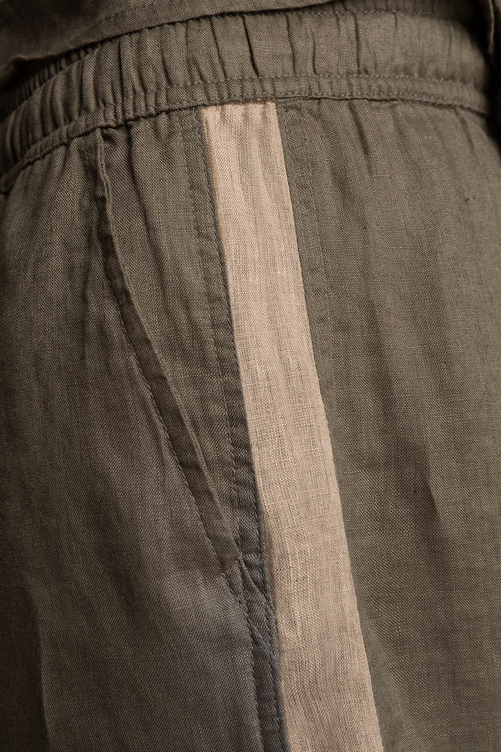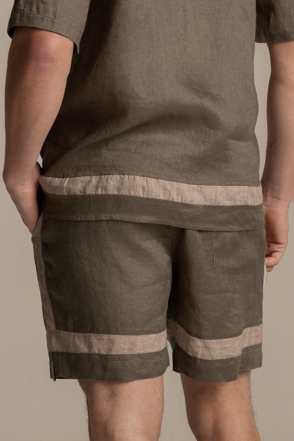 Military green and sand color block linen faro shorts, relaxed fit, side pockets, elastic waistband with drawstring, back patch pocket. Colour green/sand, Ref. BH61V61