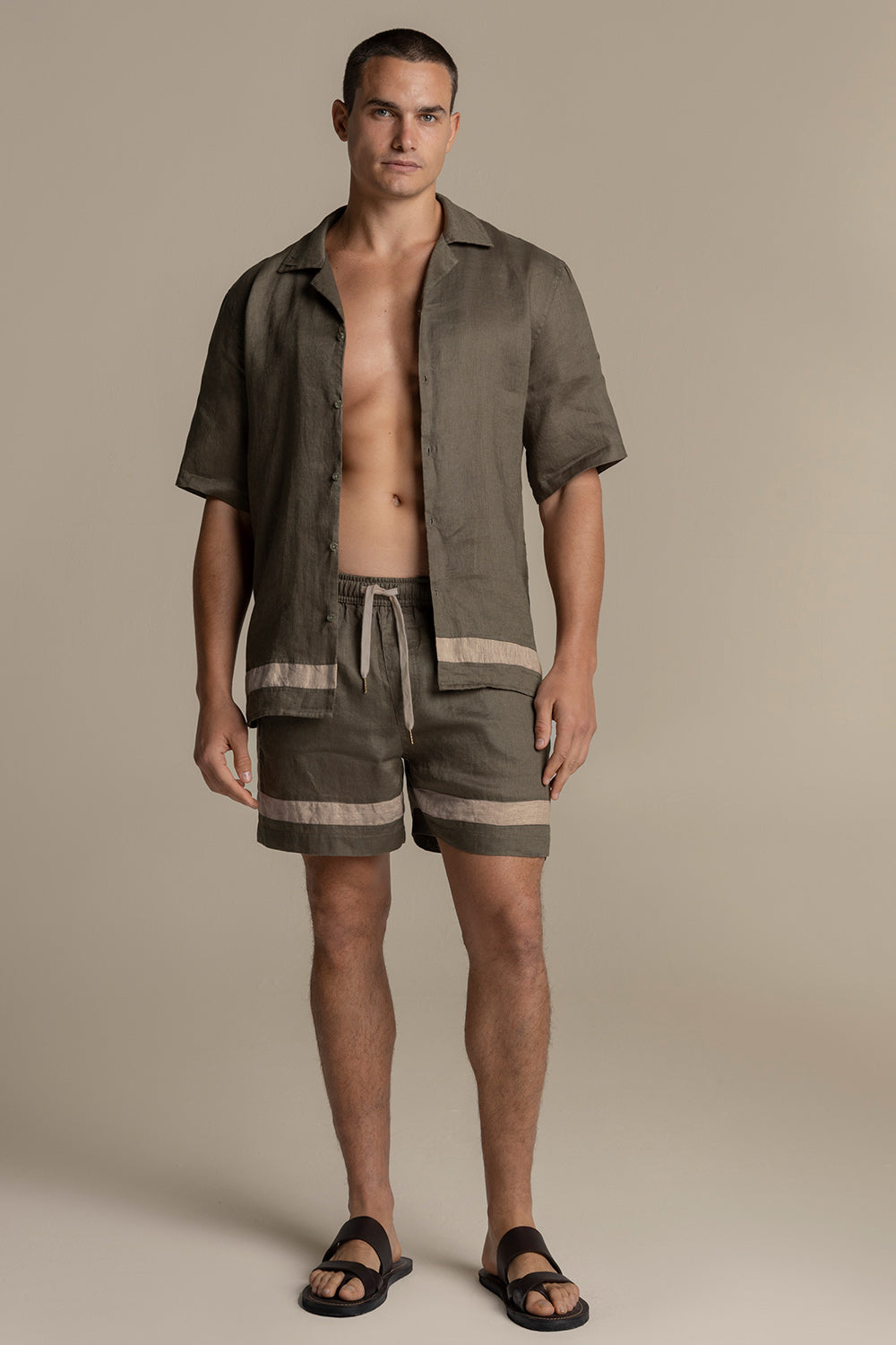 Linen Ibiza shirt with military green and sand color blocks, short sleeves, relaxed fit, bowling collar.. Colour green/sand, Ref. SH45V61