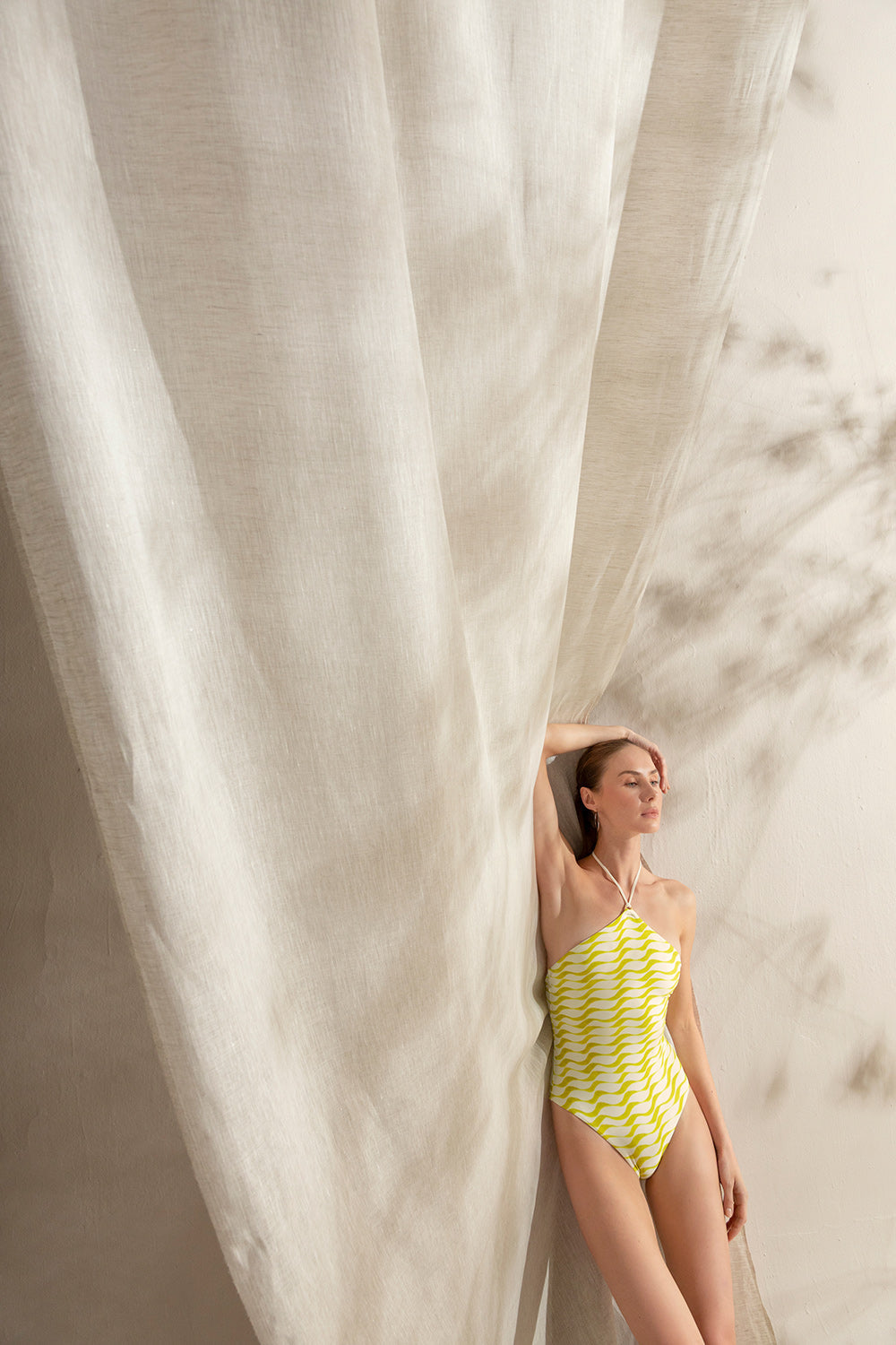 Halter one piece in green and off-white print with gold ring detail and contrast straps, adjustable ties straps for a customizable fit, gold- dipped details to avoid oxidation, removable padding, uv protection fabric. Color print