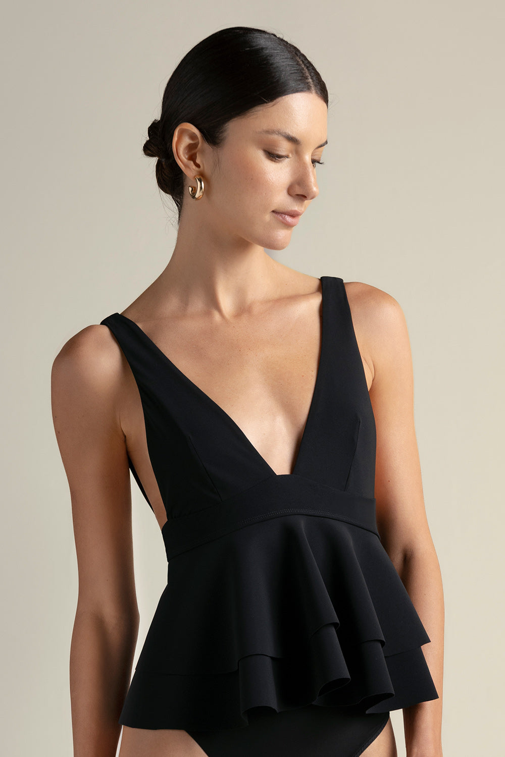 Large triangle bikini top in tankini style with ruffles, black color, tie-back closure for custom fit, removable padding, uv protection fabric.. Color black, Ref. 0B51N61