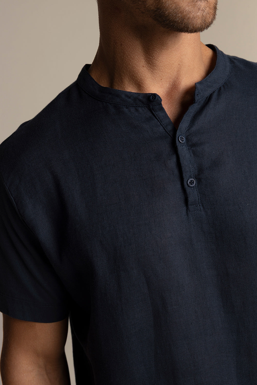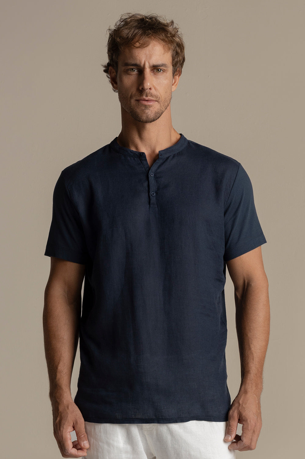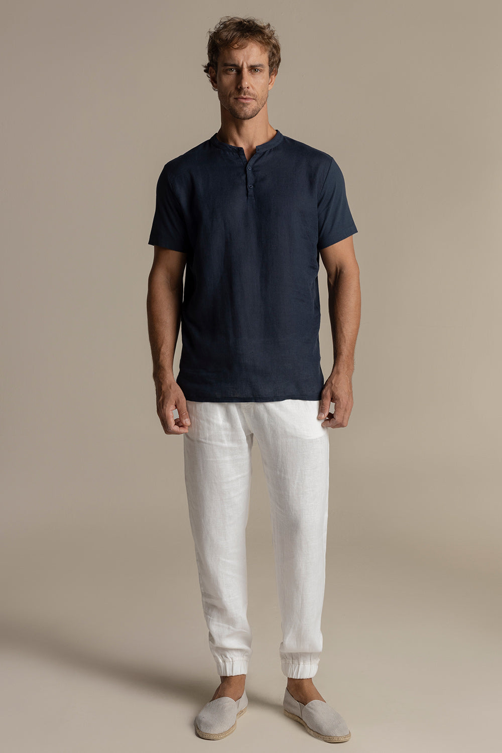 Linen/cotton t-shirt, front in linen, back in cotton, banded collar. Color White Ref. SH38A41