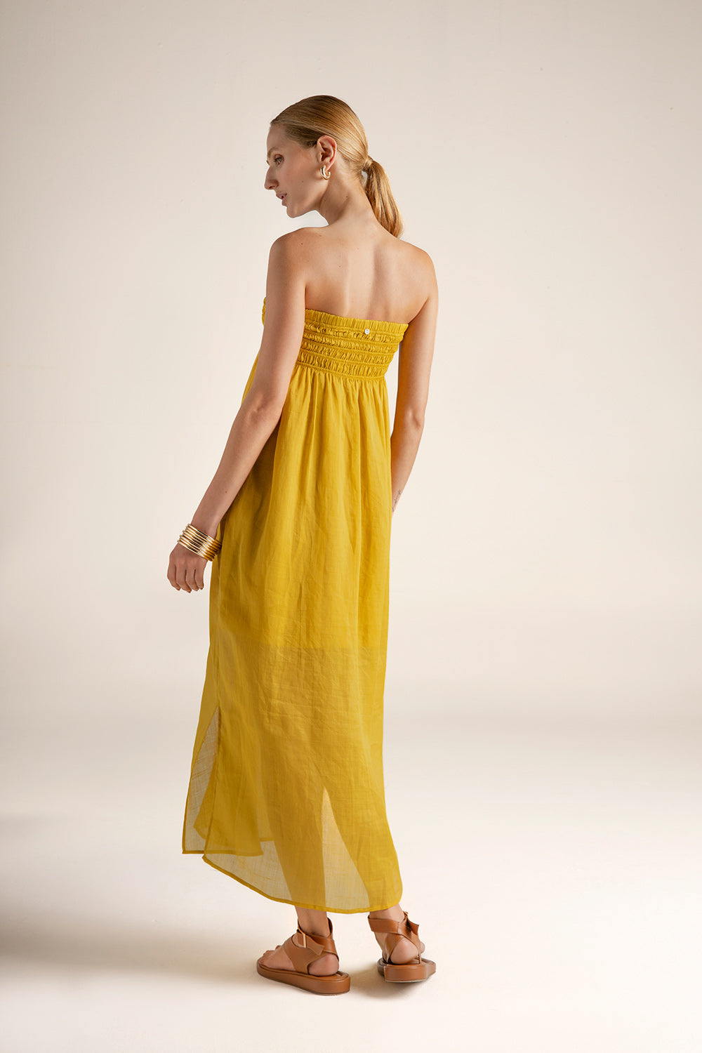 Designed to be worn as a long skirt or midi bandeau dress; in ramie fabric; shirred upper section; side slits at hem; lined. Color mustard, Ref. 0F59M62