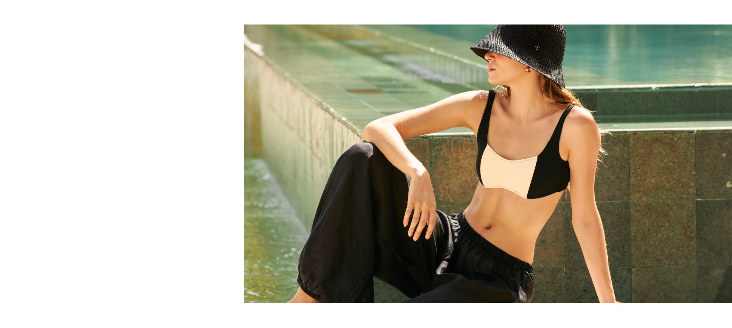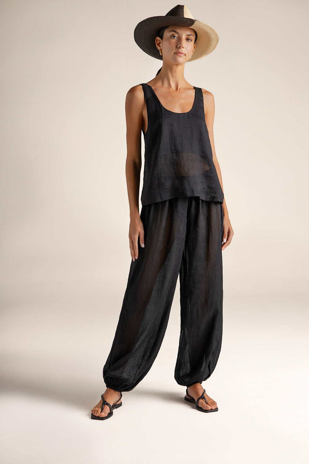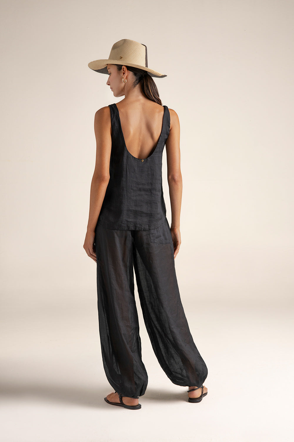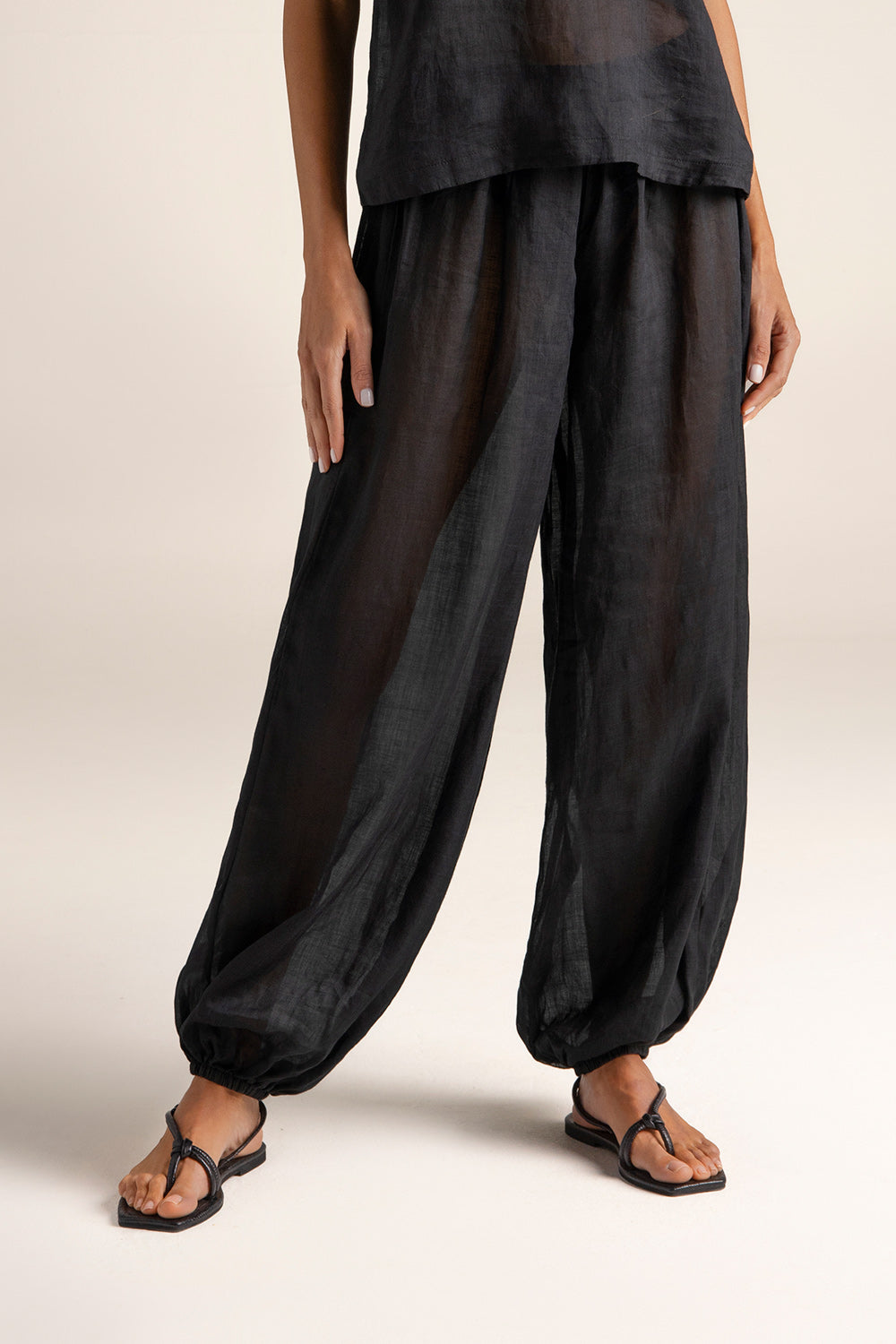 Pants in ramie fabric; semi-sheer finish; balloon silhouette with elastic at ankle; shirred waistband with gold-plated plaque engraved “Touché”; back right patch pocket; gold-plated coin with engraved “T”, a distinctive brand detail. Color black, Ref. 0A36N62