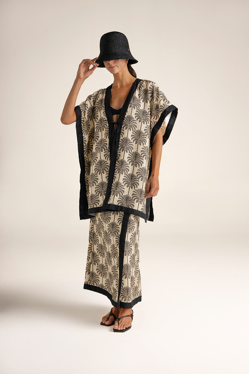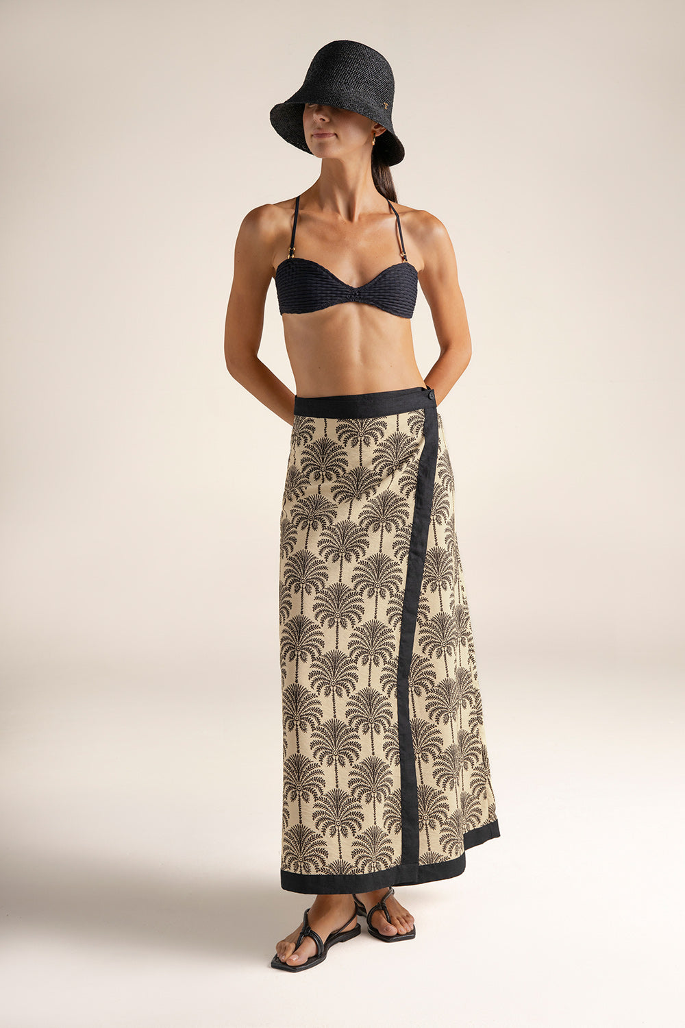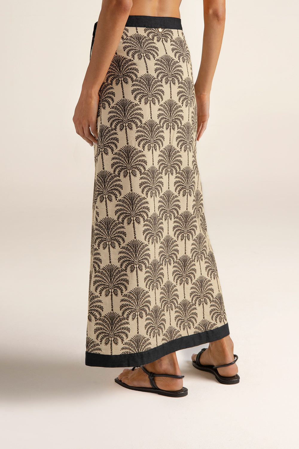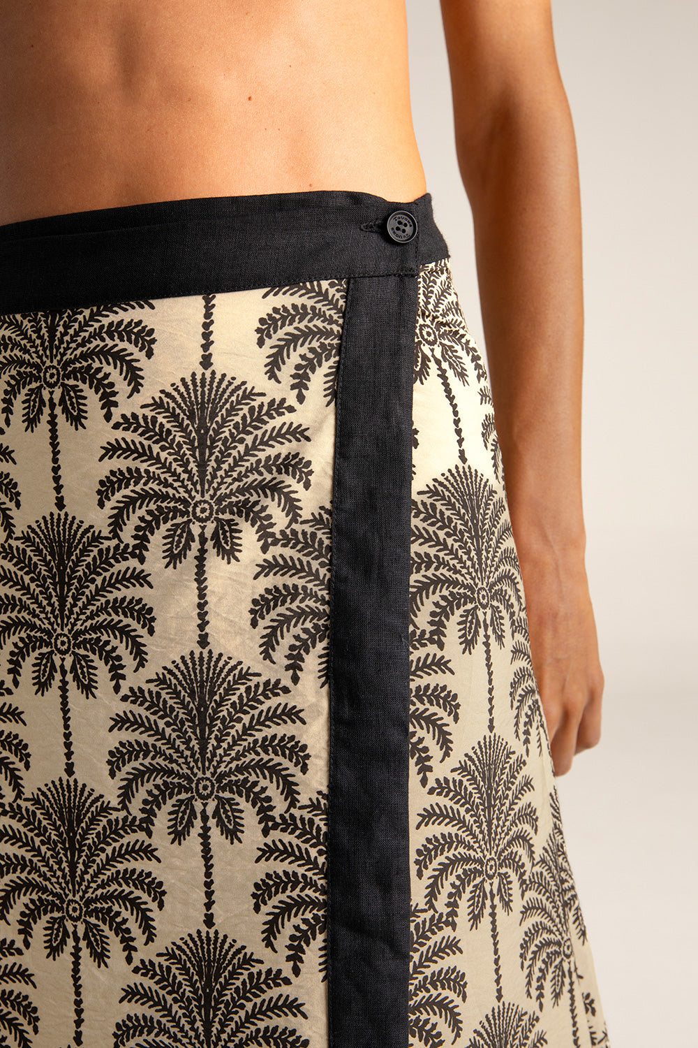 Long pareo skirt in palm-print fabric with linen trims; buttons on both sides of waistband for better waist adjustment; gold-plated coin with engraved “T”, a distinctive brand detail. Color ivory/black print, Ref. 0F73062