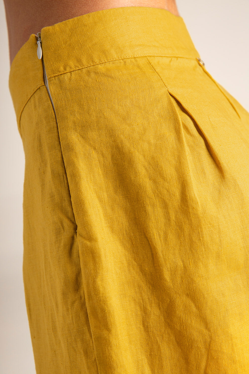 Linen shorts; high waist; wide silhouette; front and back pleats; invisible zipper on the left side; V-shaped front waistband; gold-plated coin with engraved “T”, a distinctive brand detail. Color mustard, Ref. 0A18M62
