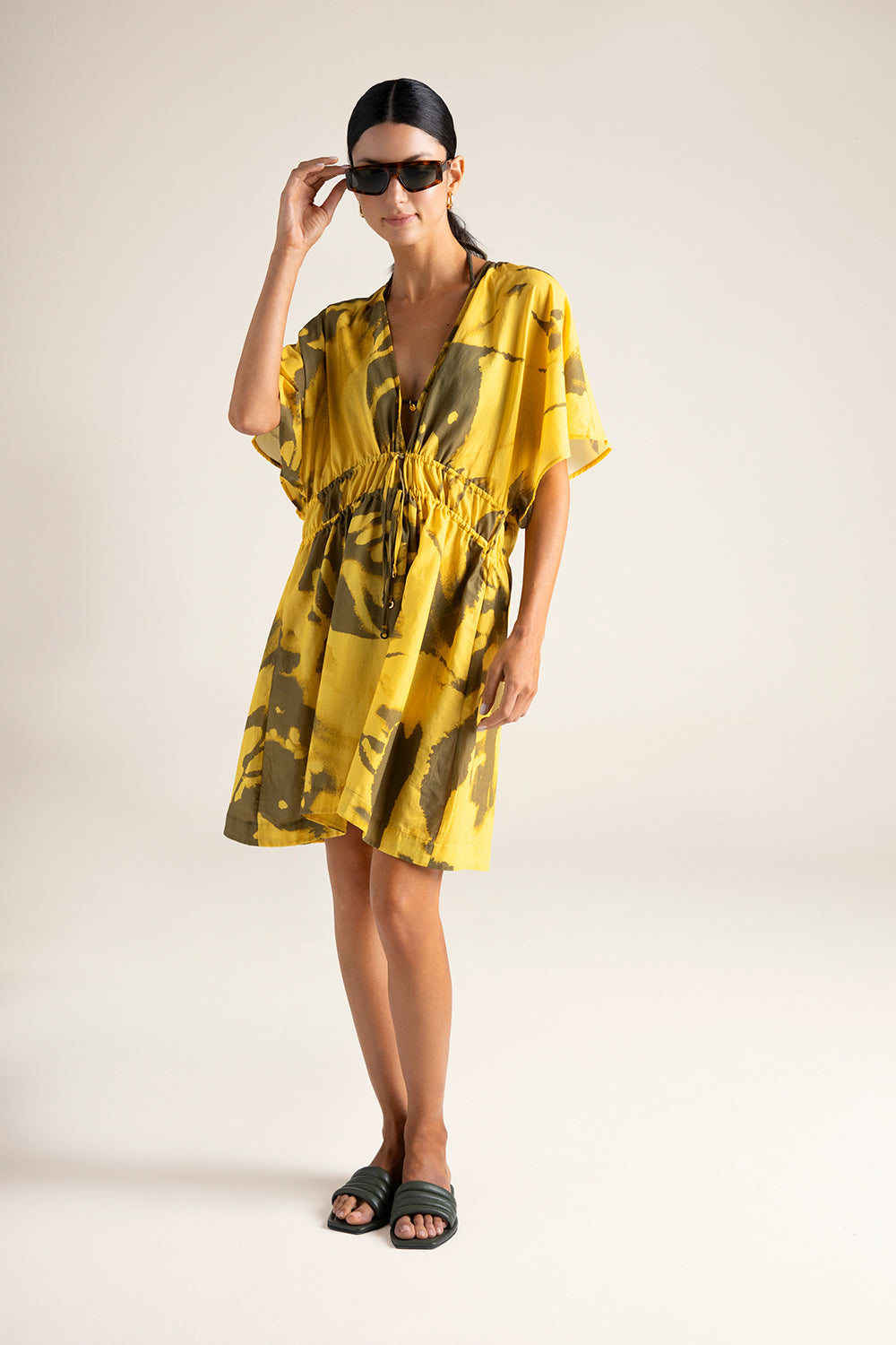 Short cover-up in printed fabric; deep V-neck; short sleeves; waistband with double drawstring and adjustable ties; gold-plated rings with “Touché” engraving as final detail on ties; gold-plated coin with engraved “T”, a distinctive brand detail. Color yellow / green print, Ref. 0A40062