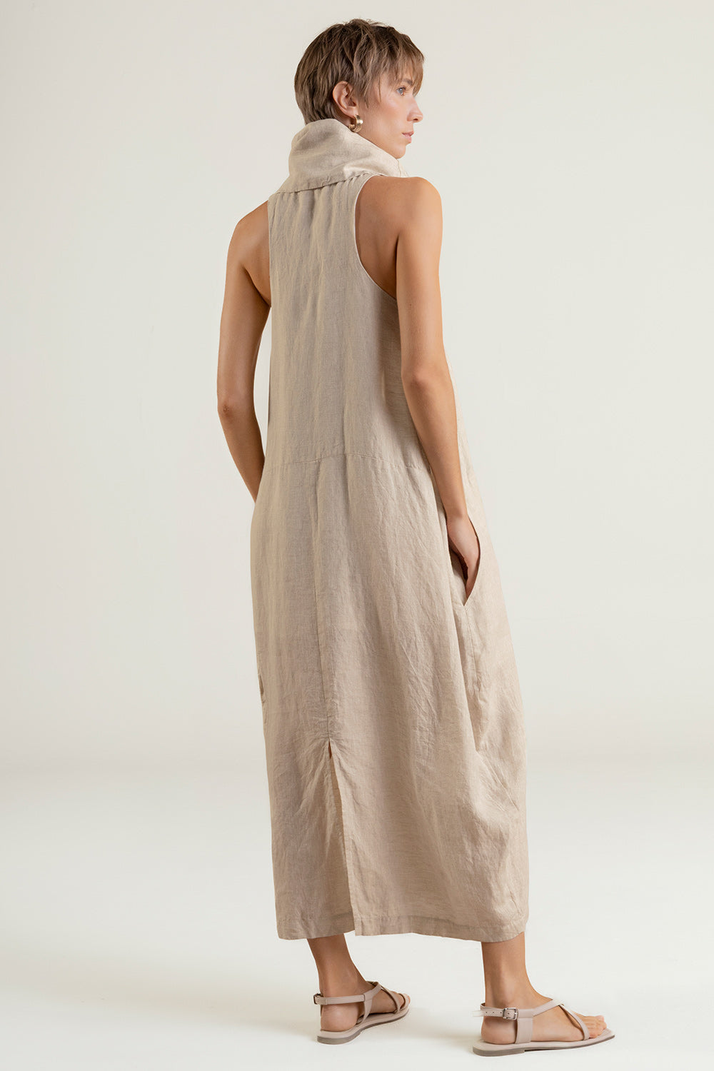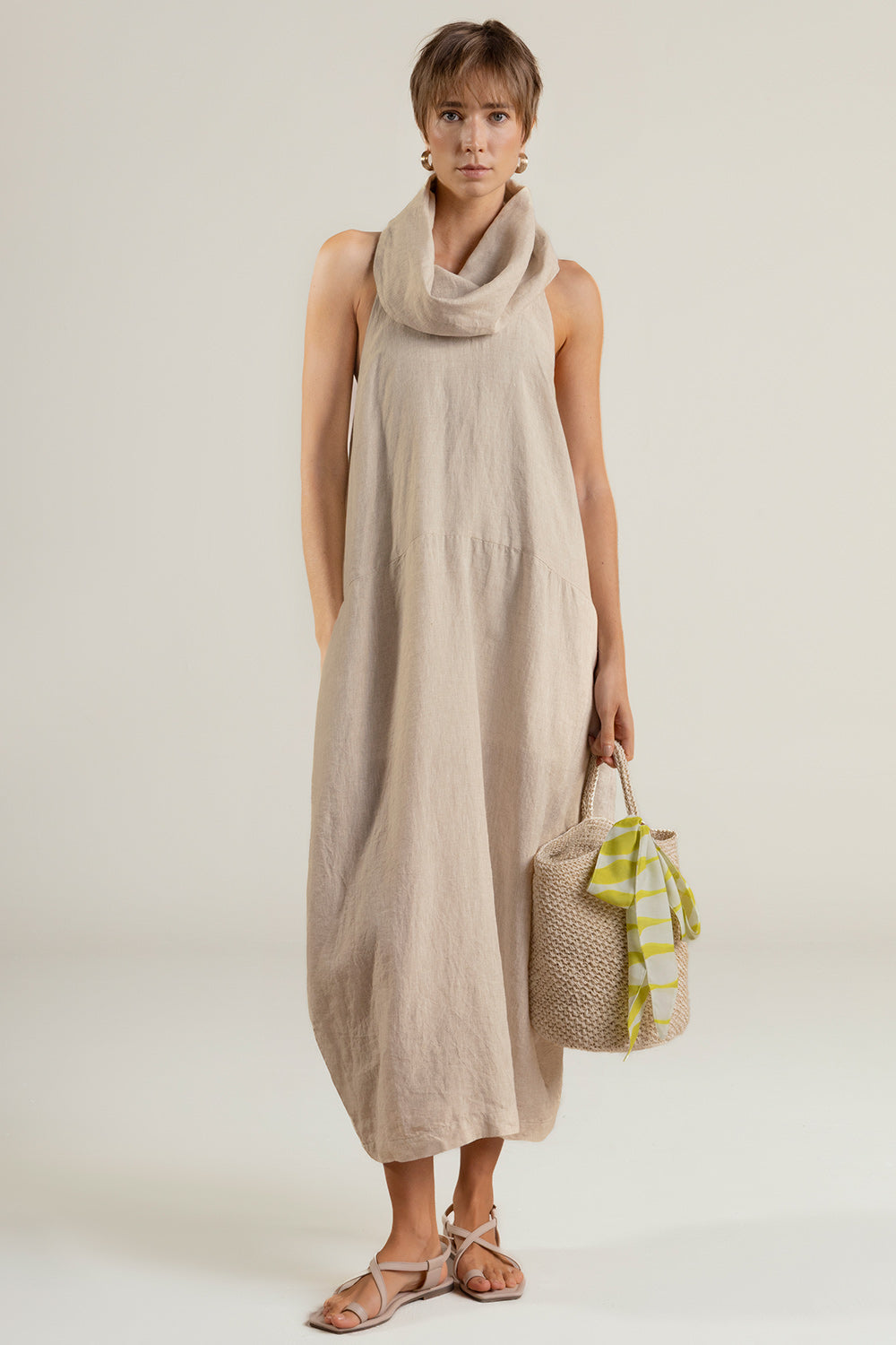 Balloon shaped long dress in 100% khaki linen with draped neckline and pockets, interior lining, coin detail characteristic of our brand with "t" engraved in gold - dipped to avoid oxidation.. Color khaki, Ref. 0F13C53