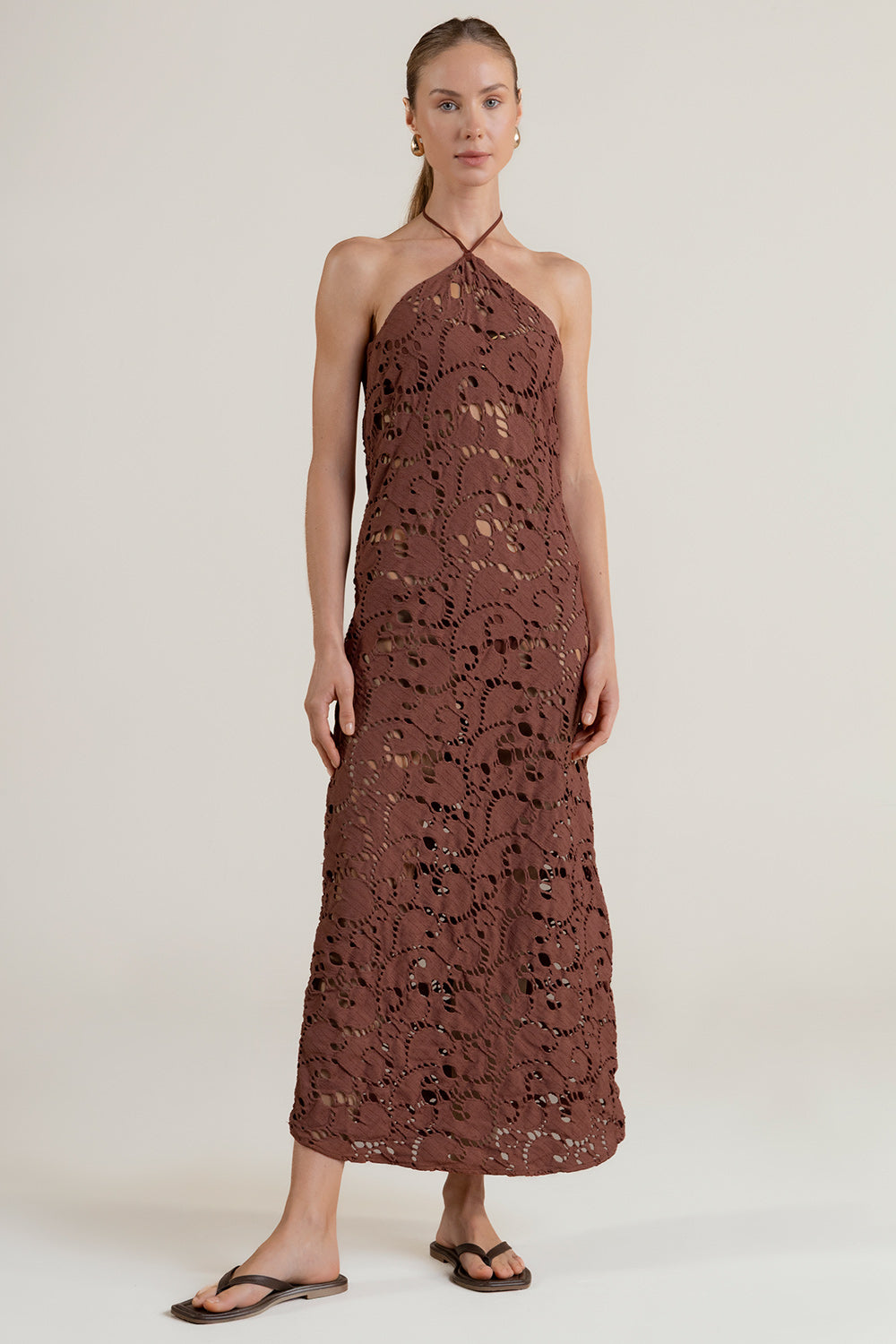 Halter long dress in terracotta textured fabric with removable inner dress, low open back, coin detail characteristic of our brand with "t" engraved in gold - dipped to avoid oxidation.