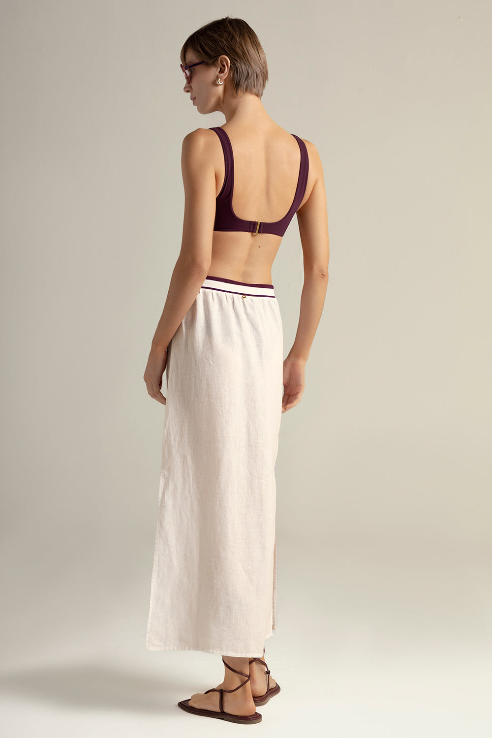 Long skirt in 100% linen, white color, with burgundy and white rib elastic waistband, gold-plated coin detail characteristic of our brand with "t" engraved.. Color white, Ref. 0F20B61