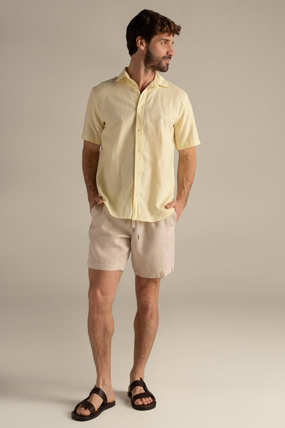 Yellow linen bali shirt, short sleeves, classic fit, classic collar. Color green/sand, Ref. SH73A62