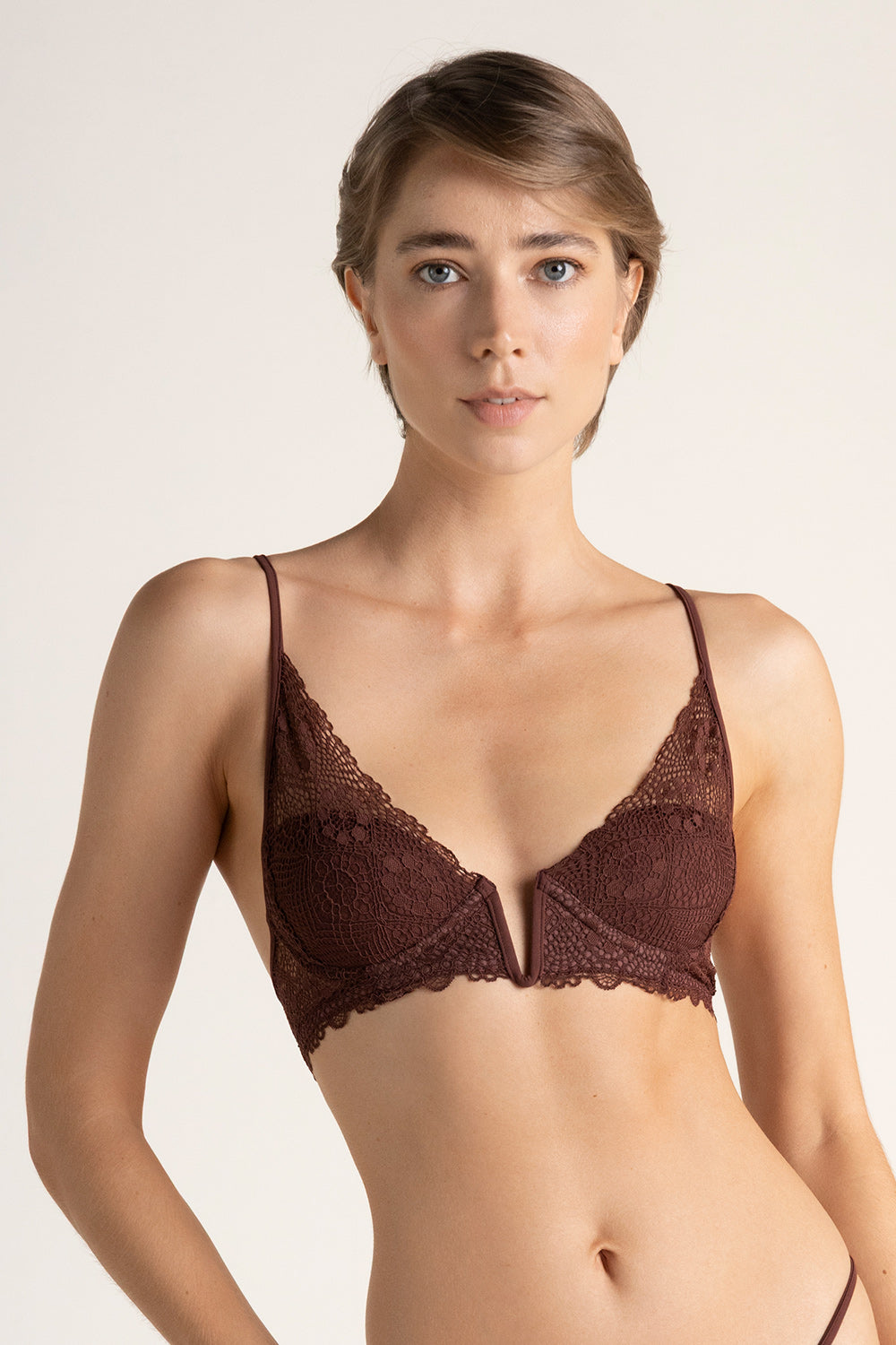 Classic lace bra with pads and underwire. v-shaped metal wire at center bust. adjustable straps. fasteners at back. Color brown, Ref. 2488C61