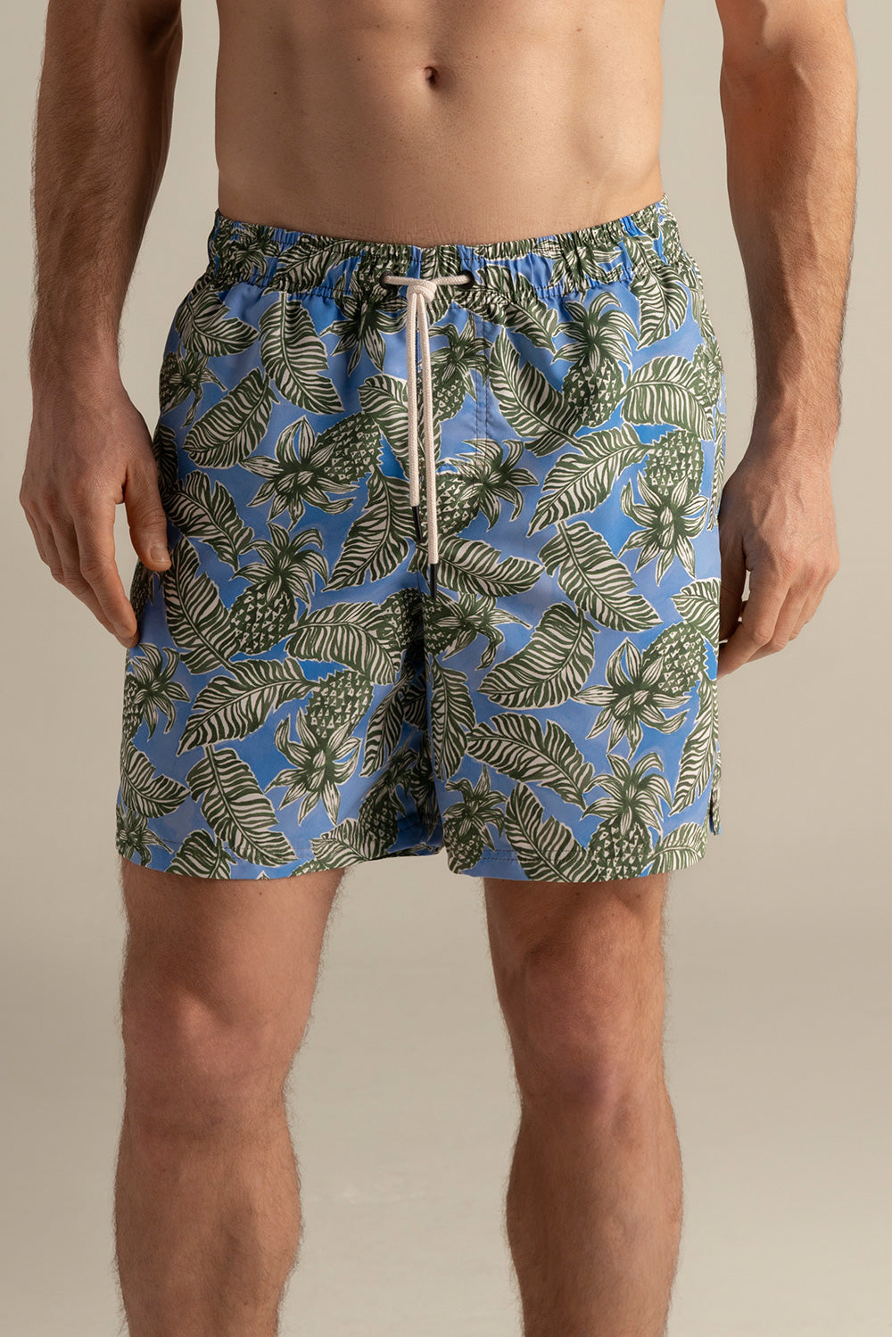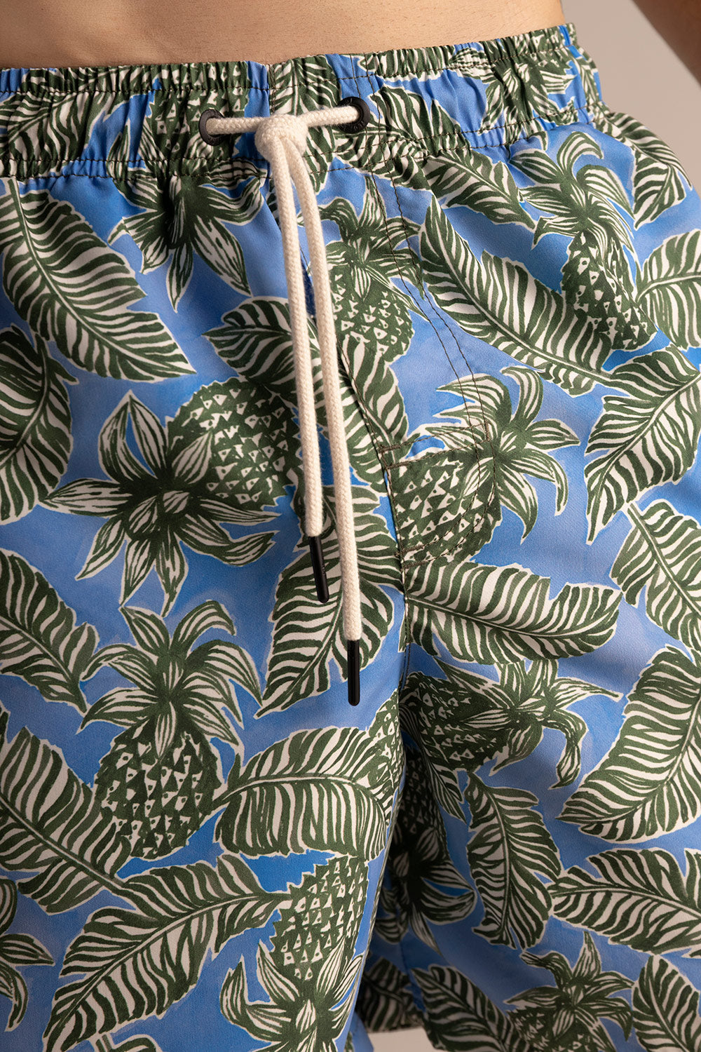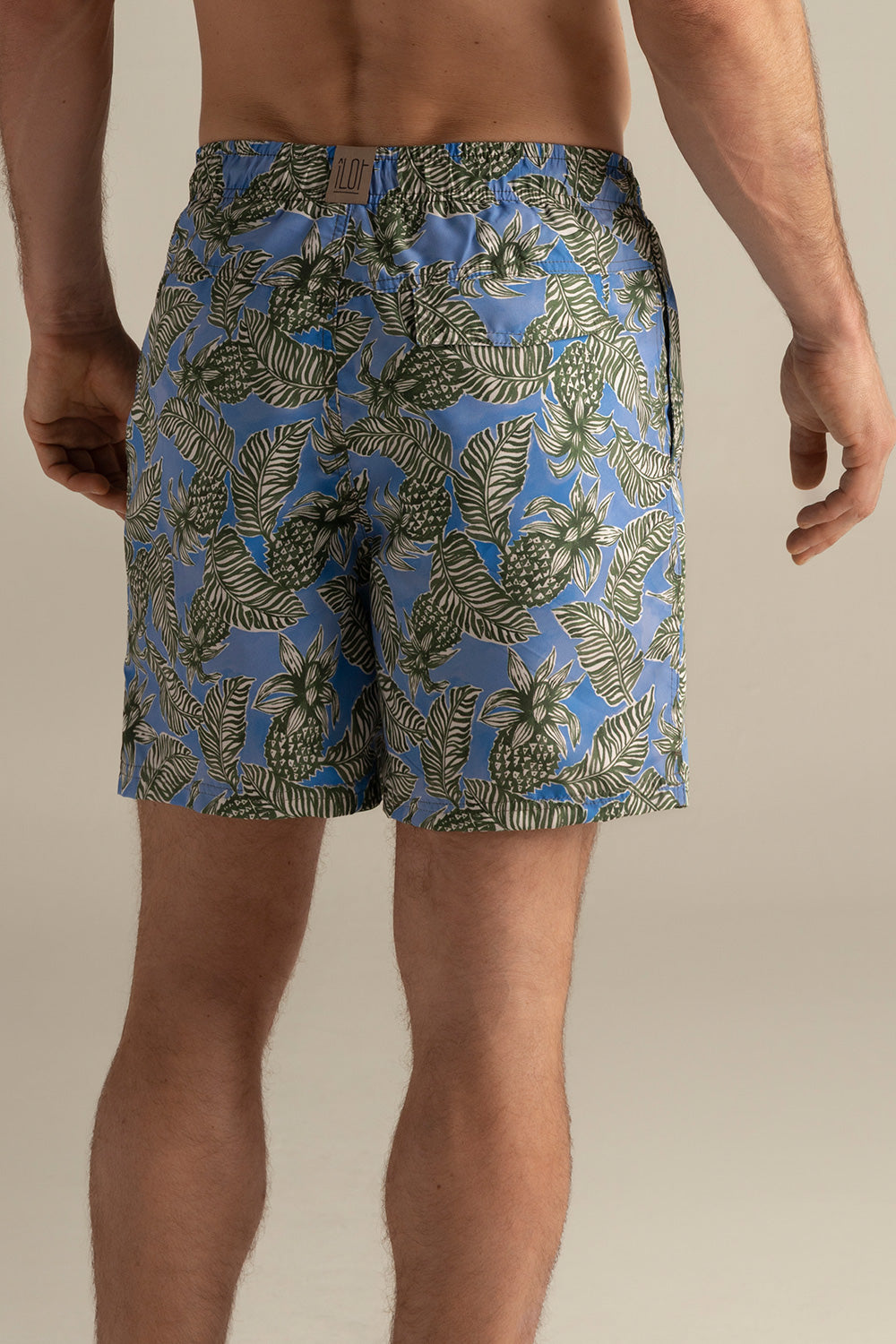 Peninsula short-length swim shorts, blue pineapple and leaf print, classic cut with elastic waistband and off-white drawstring with matte black metal tips, matte black zamak eyelets, and flap pocket. Color blue/green, Ref. CH37062-MH37062-LH37062