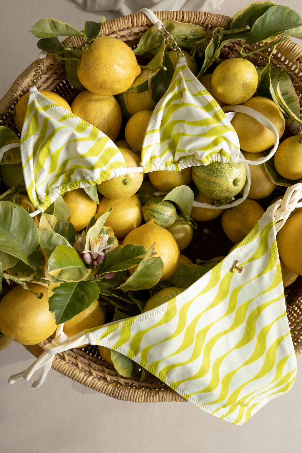 Small triangle bikini top in green and off-white print with contrast straps and golden detail, adjustable ties straps for a customizable fit, gold- dipped details to avoid oxidation, removable padding, uv protection fabric. Color print