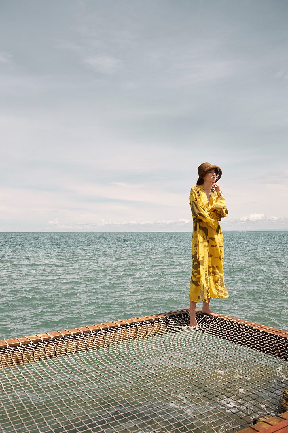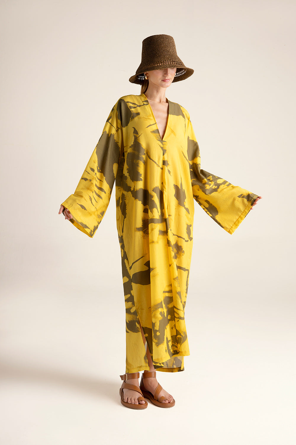 Long cover-up in printed fabric; deep V-neck; long sleeves; side slits at hem; central pleat at back; gold-plated coin with engraved “T”, a distinctive brand detail. Color yellow / green print, Ref. 0A39062