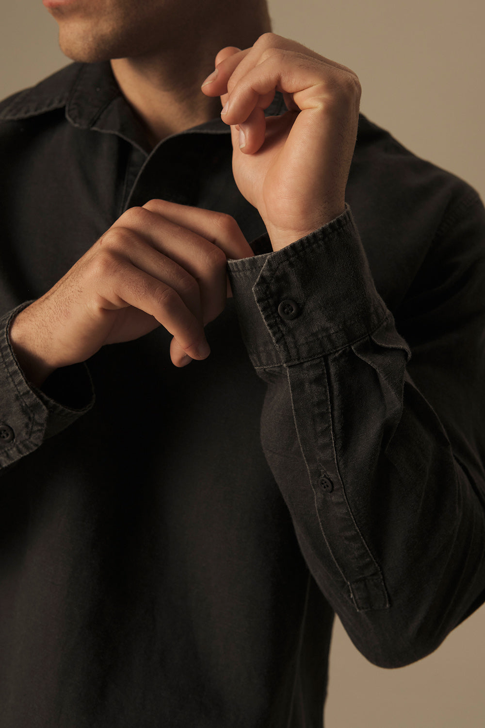 Linen black long sleeve classic fit shirt, classic collar with front opening and button closure. Color black, Ref. SH33052