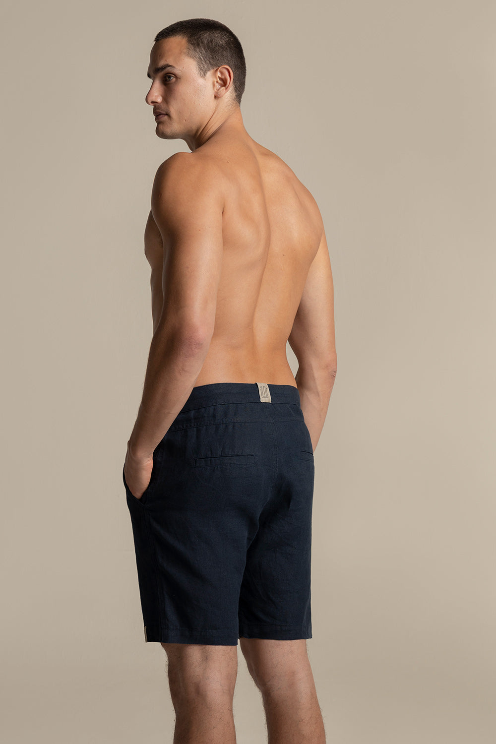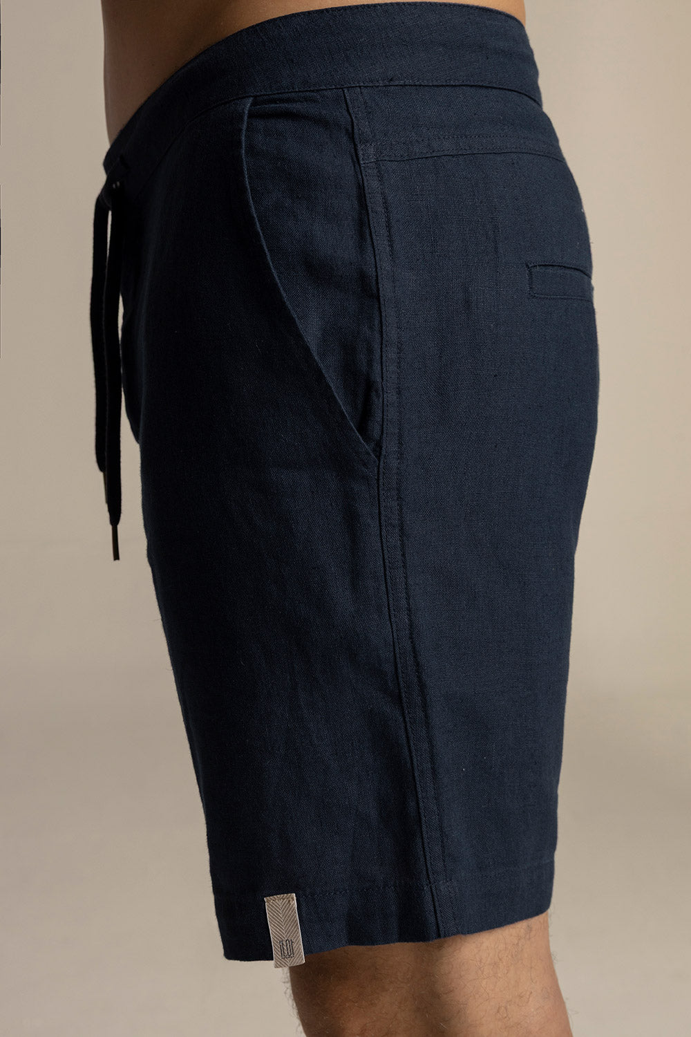 Linen riviera bermuda, front side pockets, front button, back welt pockets, drawstring waistband, belt loops. Color Dark blue Ref. BH28A31