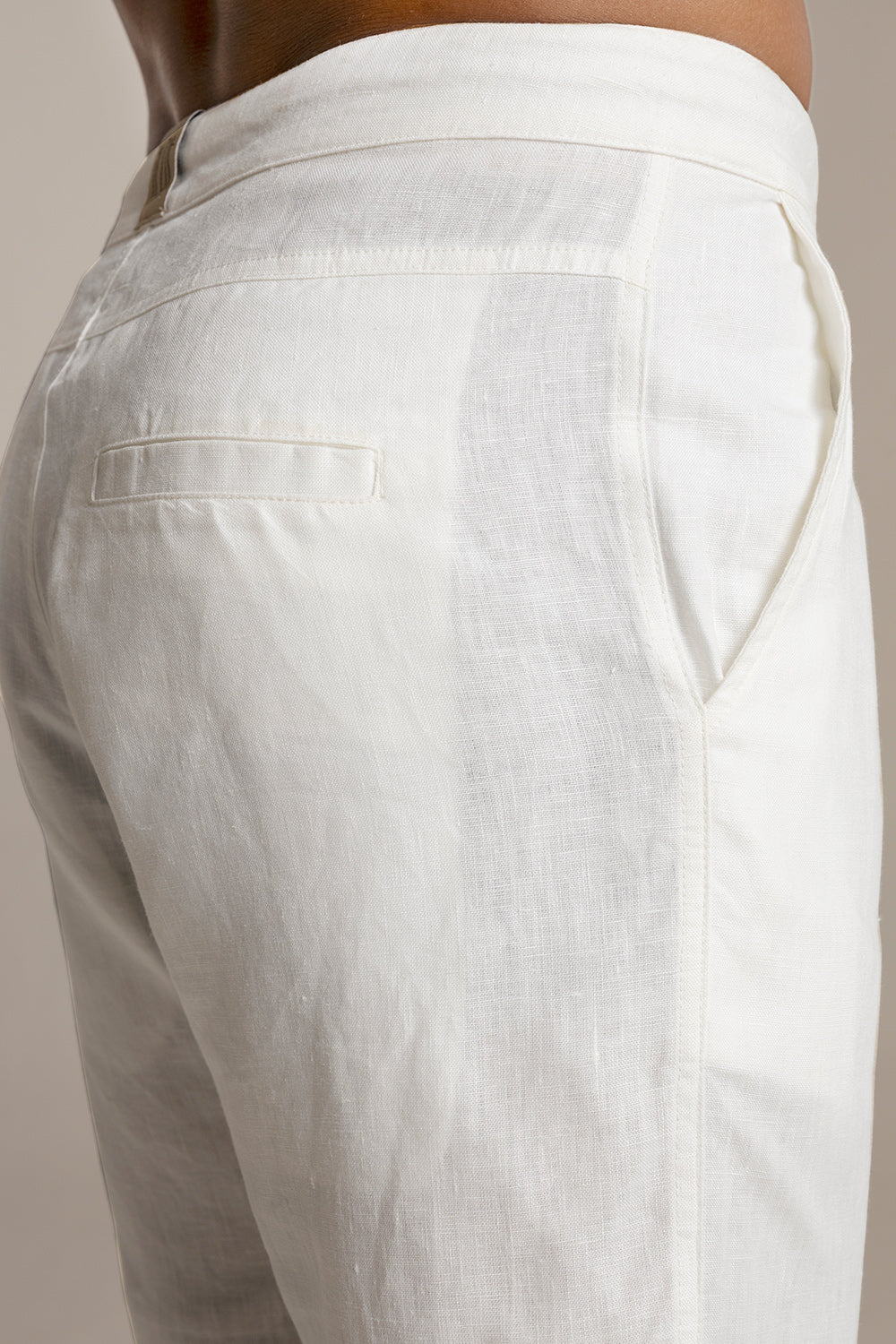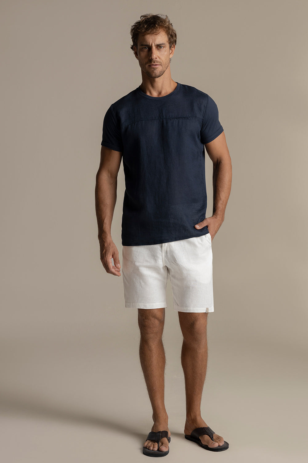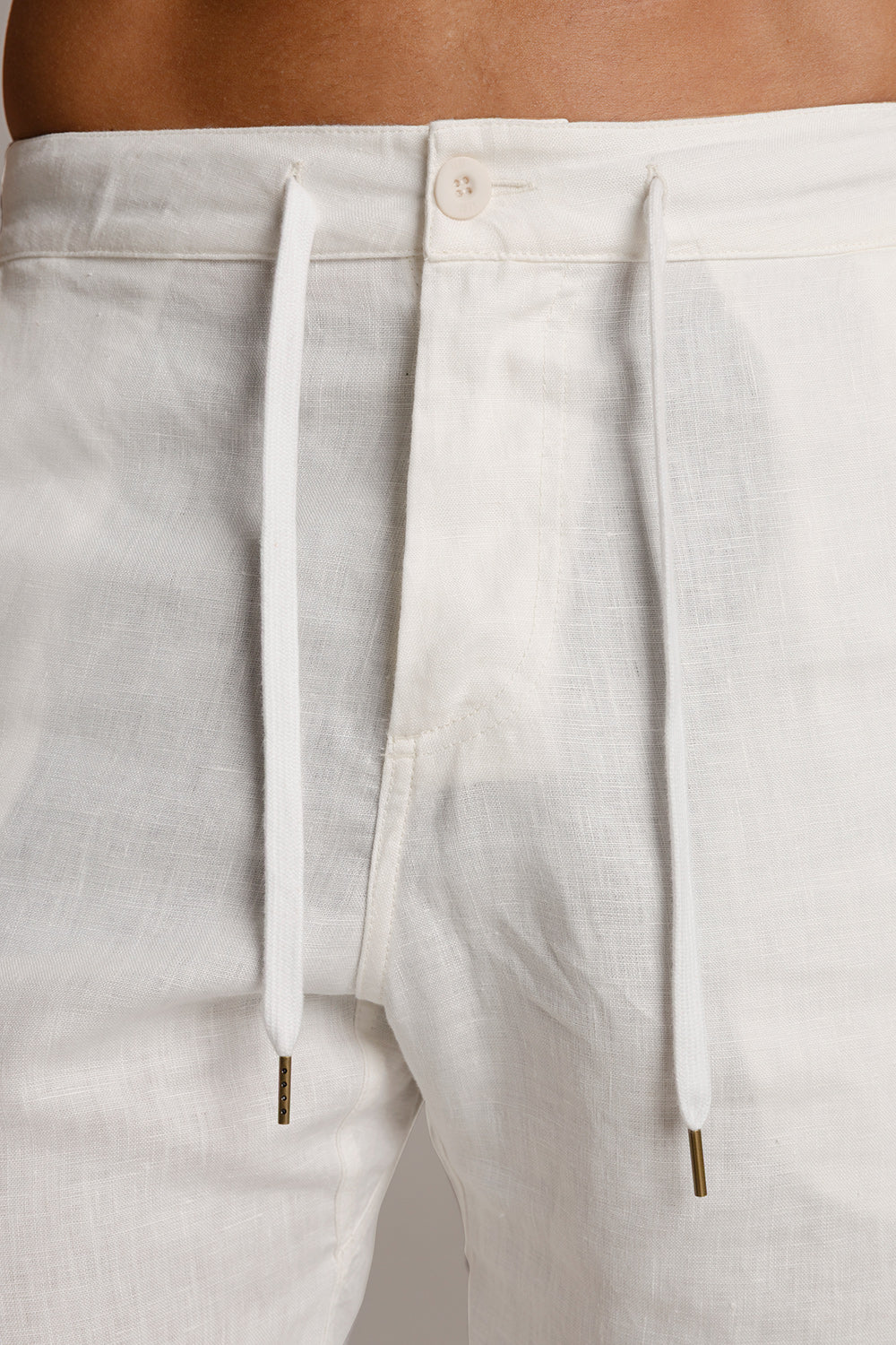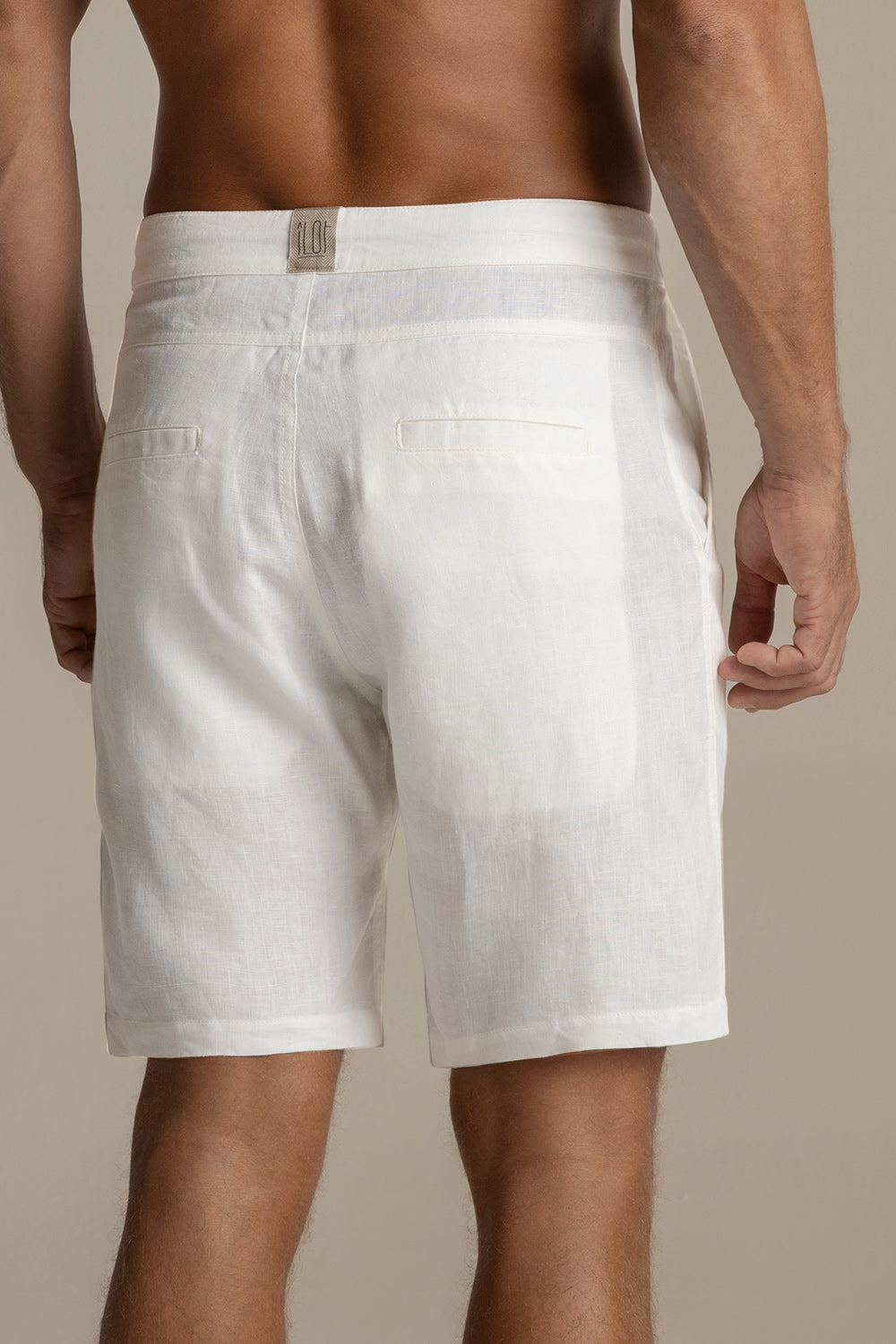 Linen riviera bermuda, front side pockets, front button, back welt pockets, drawstring waistband, belt loops. Color White Ref. BH28B31