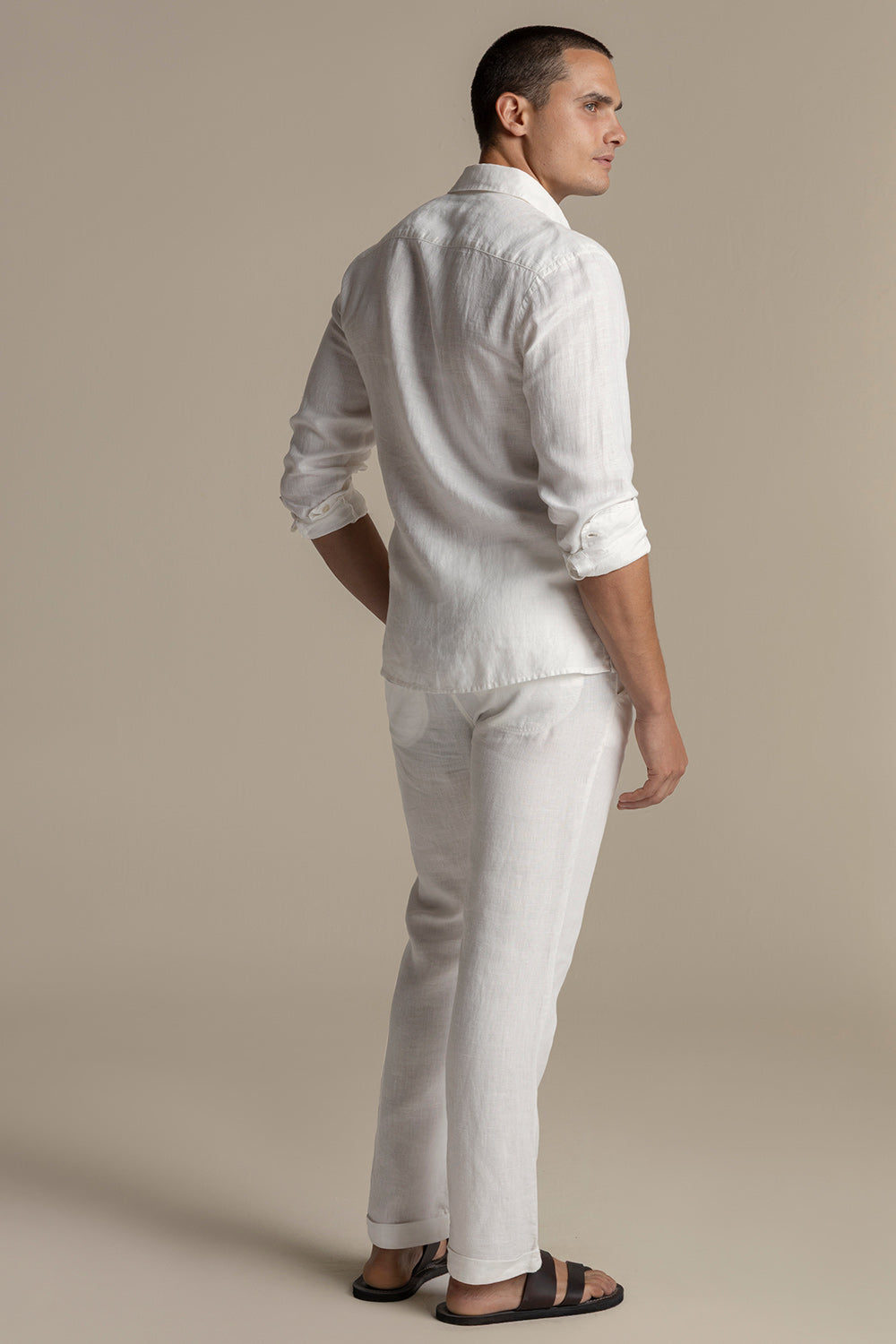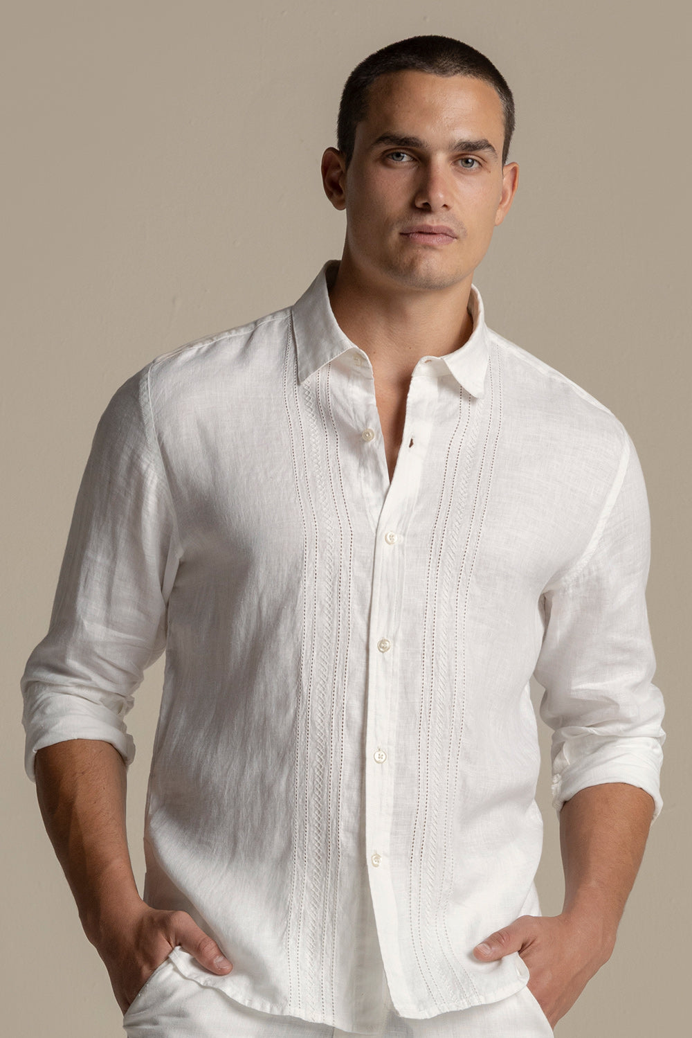 Linen capri long sleeve classic fit guayabera shirt with embroidered details in front, side plackets, front button opening, classic collar. Color White Ref. SH74041