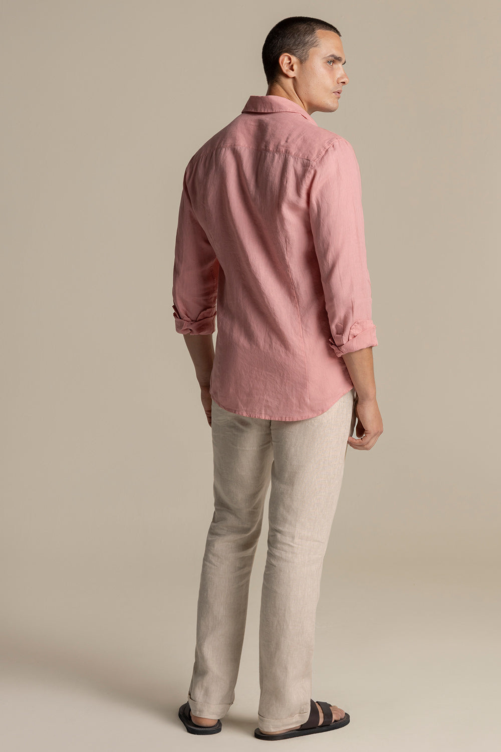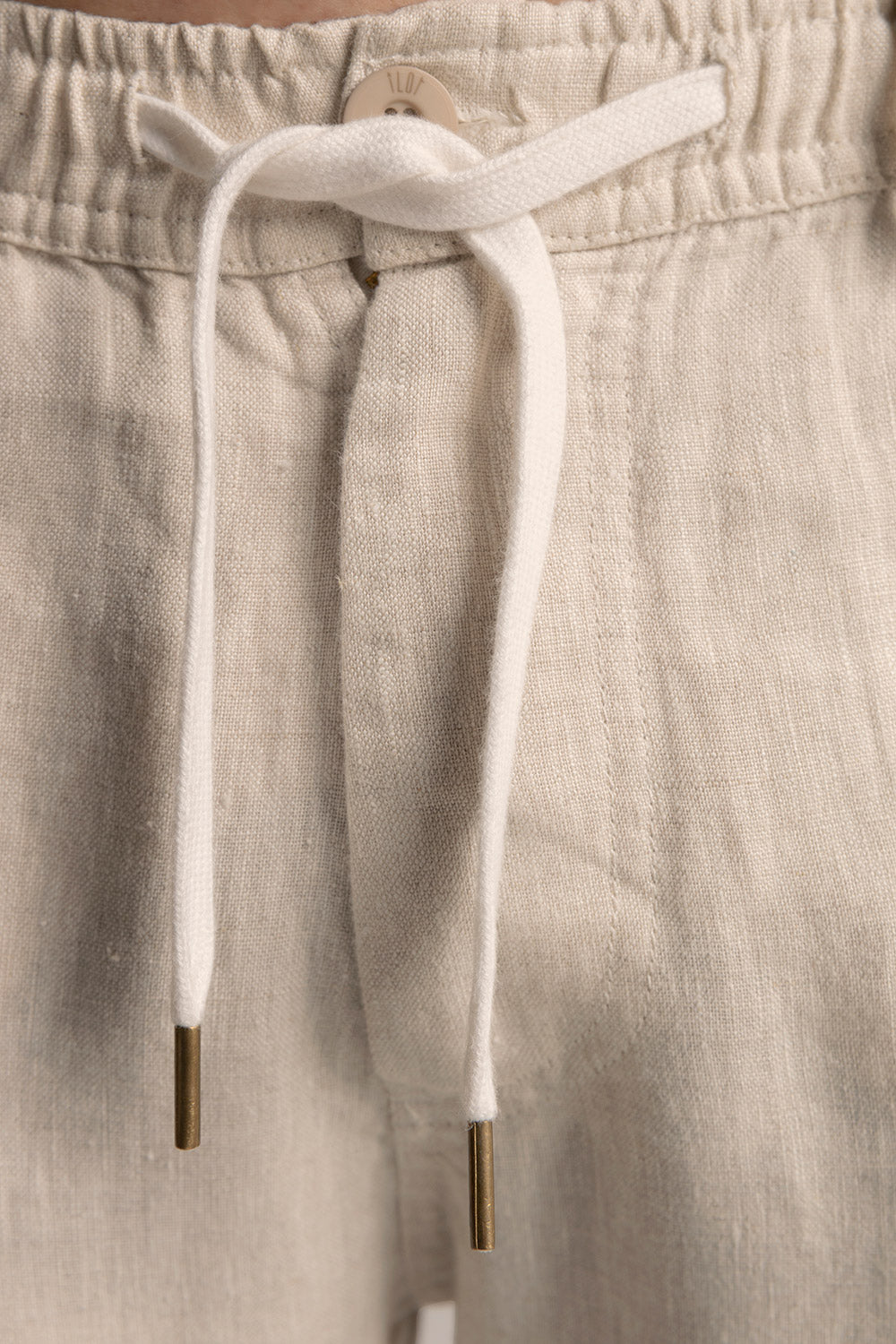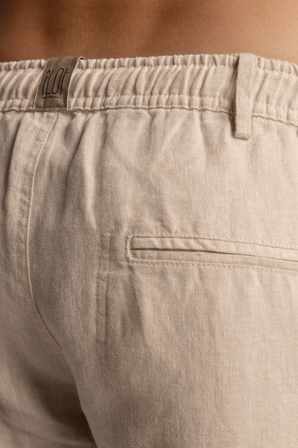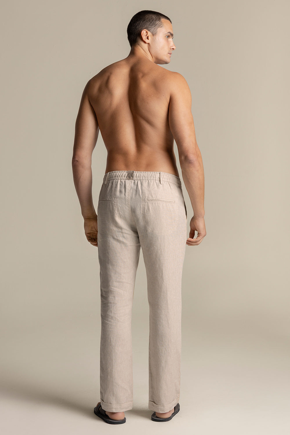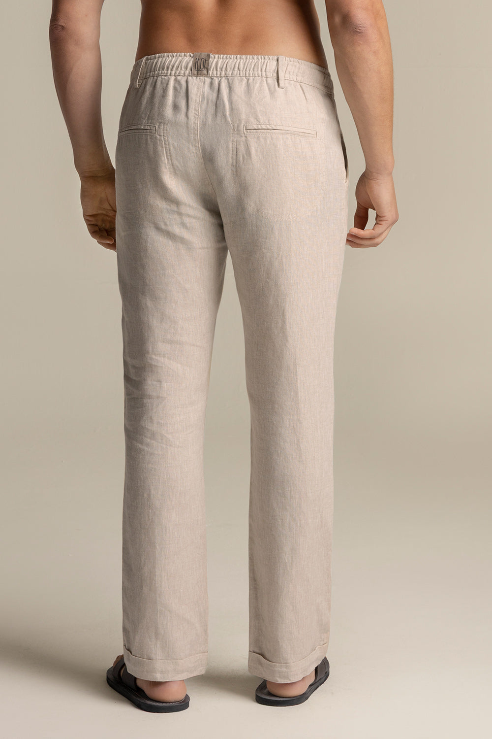 Linen cabo slim fit pants, front side pockets, front button, elastic waistband with drawstring, back welt pockets, belt loops. Color Khaki Ref. PH02K91