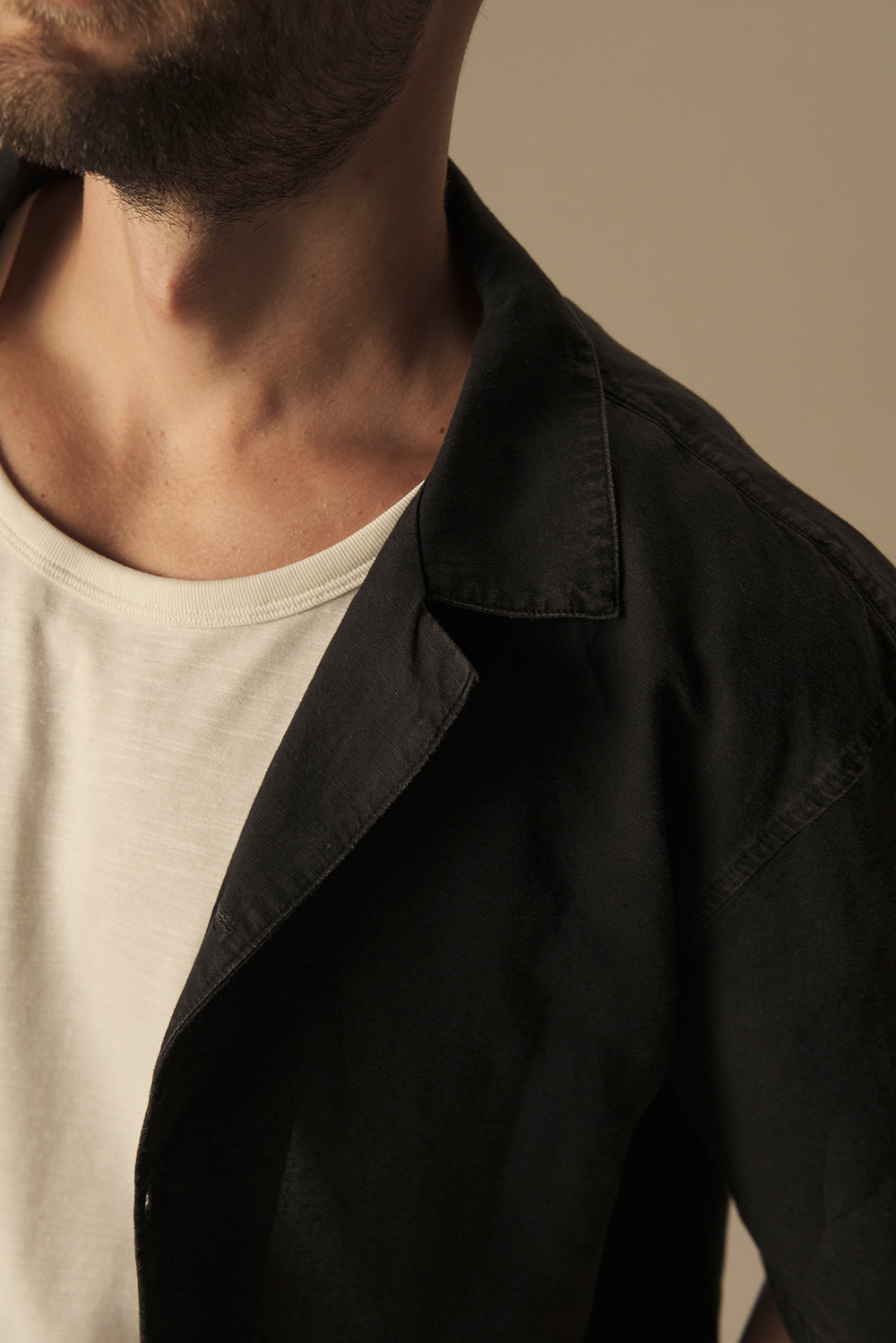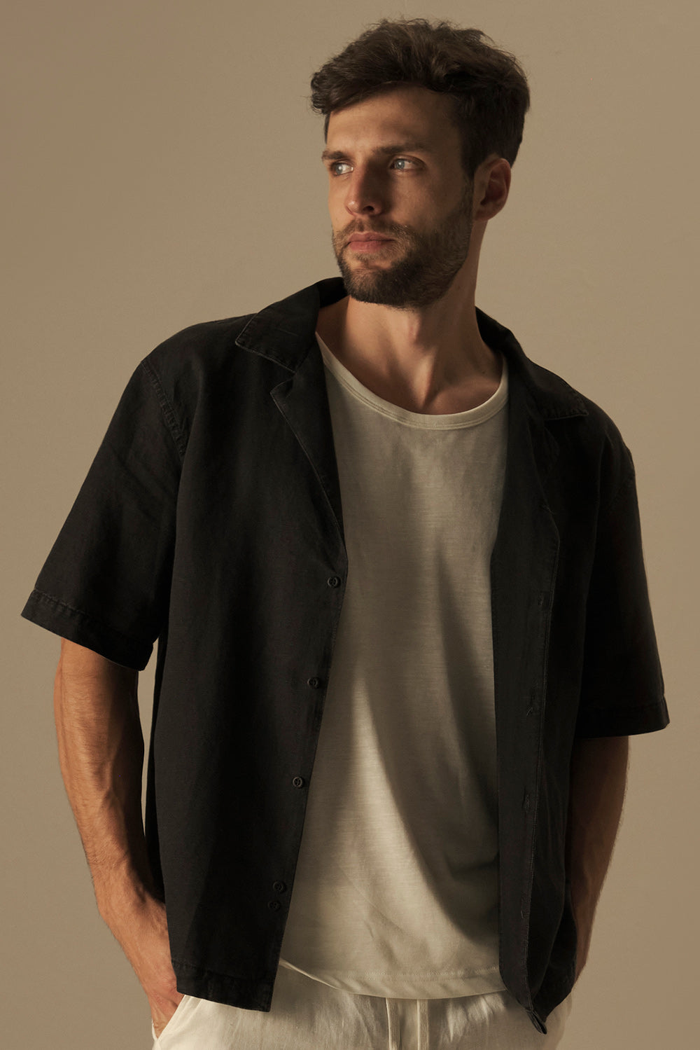 Linen black short sleeve relaxed fit bowling shirt with bowling collar . Color black, Ref. SH34052